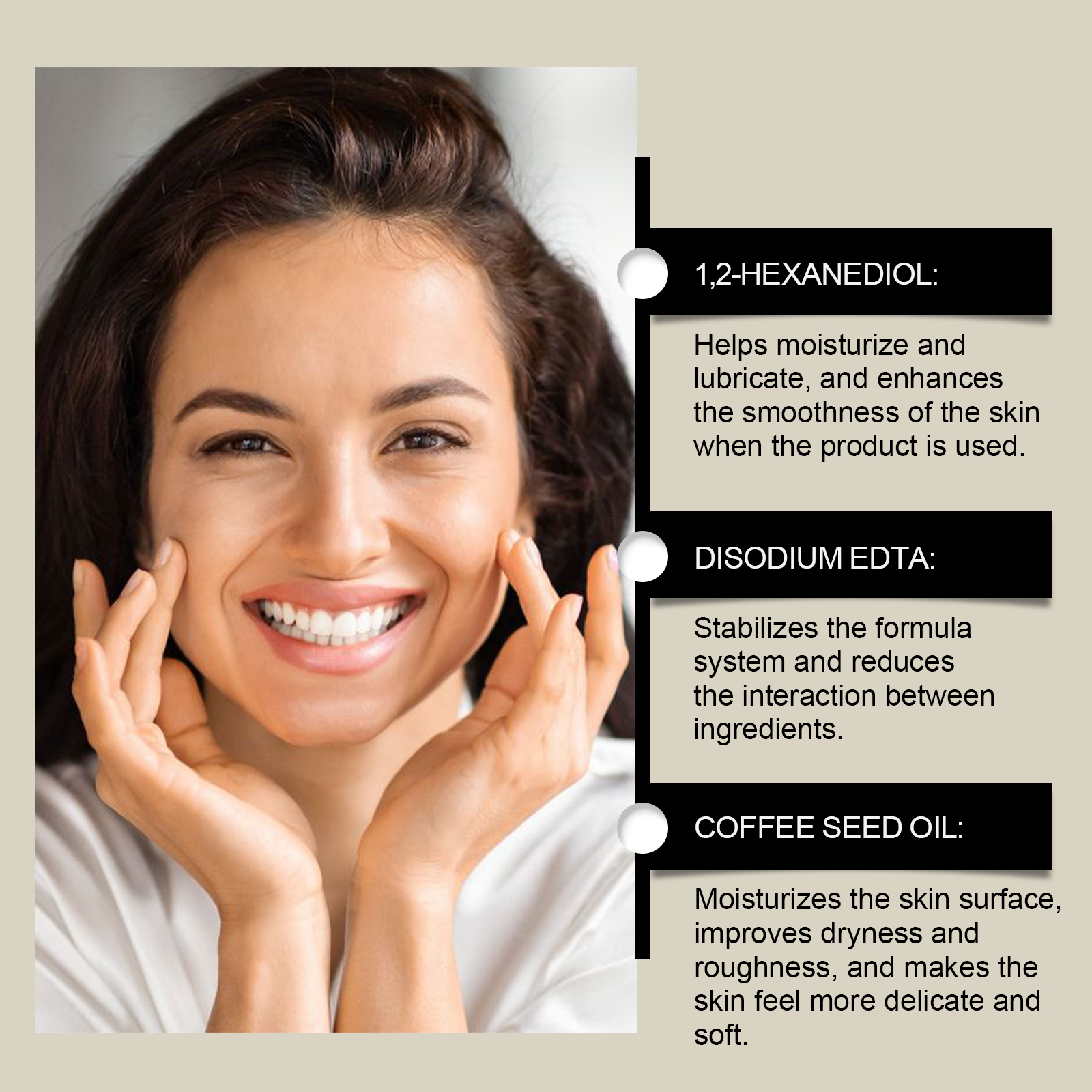 Our moisturizing and brightening essence is carefully formulated with disodium ethylenediaminetetraacetate and coffee seed oil. Designed specifically for skin care, it makes the skin full of vitality. The usage method is extremely convenient: Thoroughly clean and dry the skin, and apply an appropriate amount of this product evenly to the face. Gently massage to promote better absorption. And you can continue to use it to help your skin become softer and smoother.