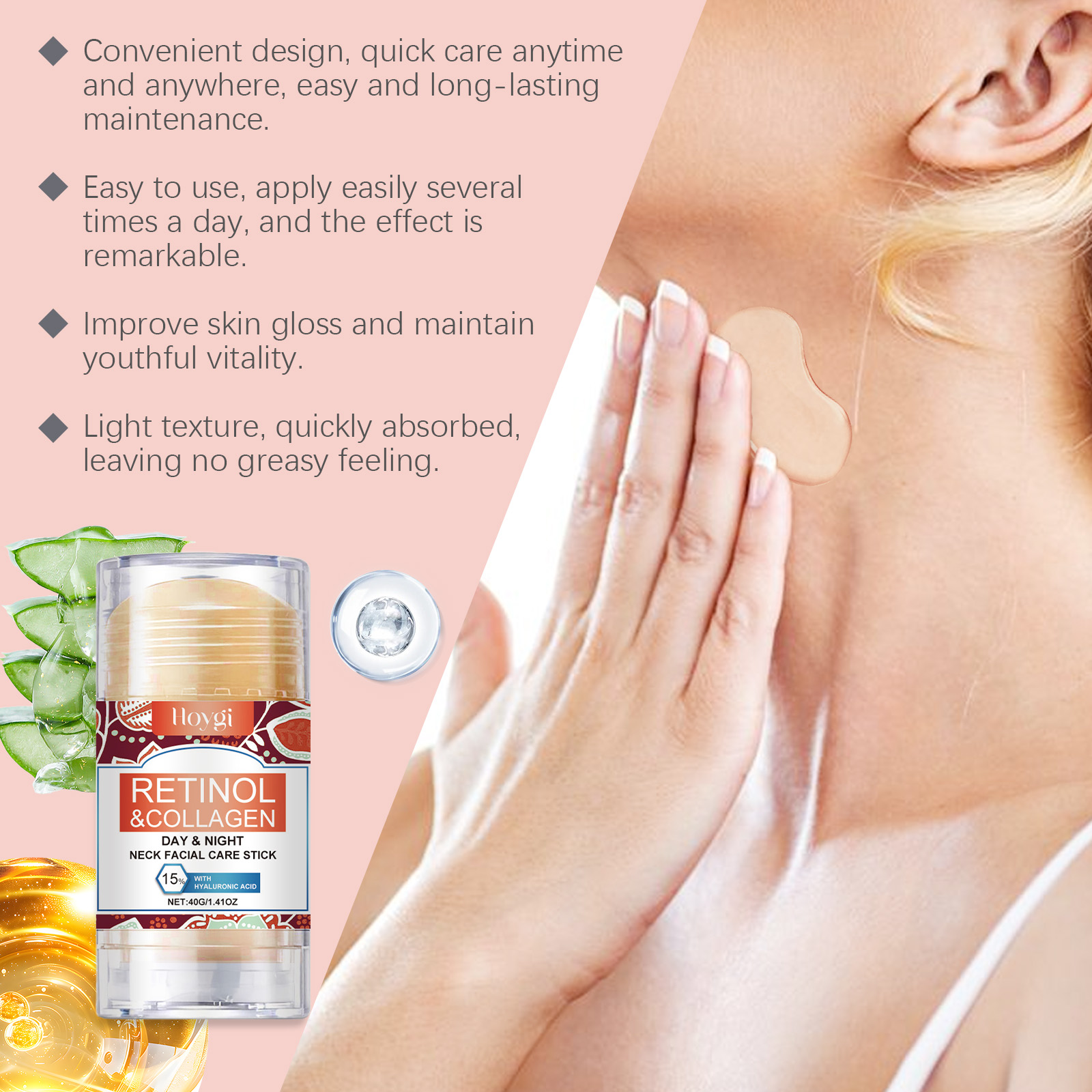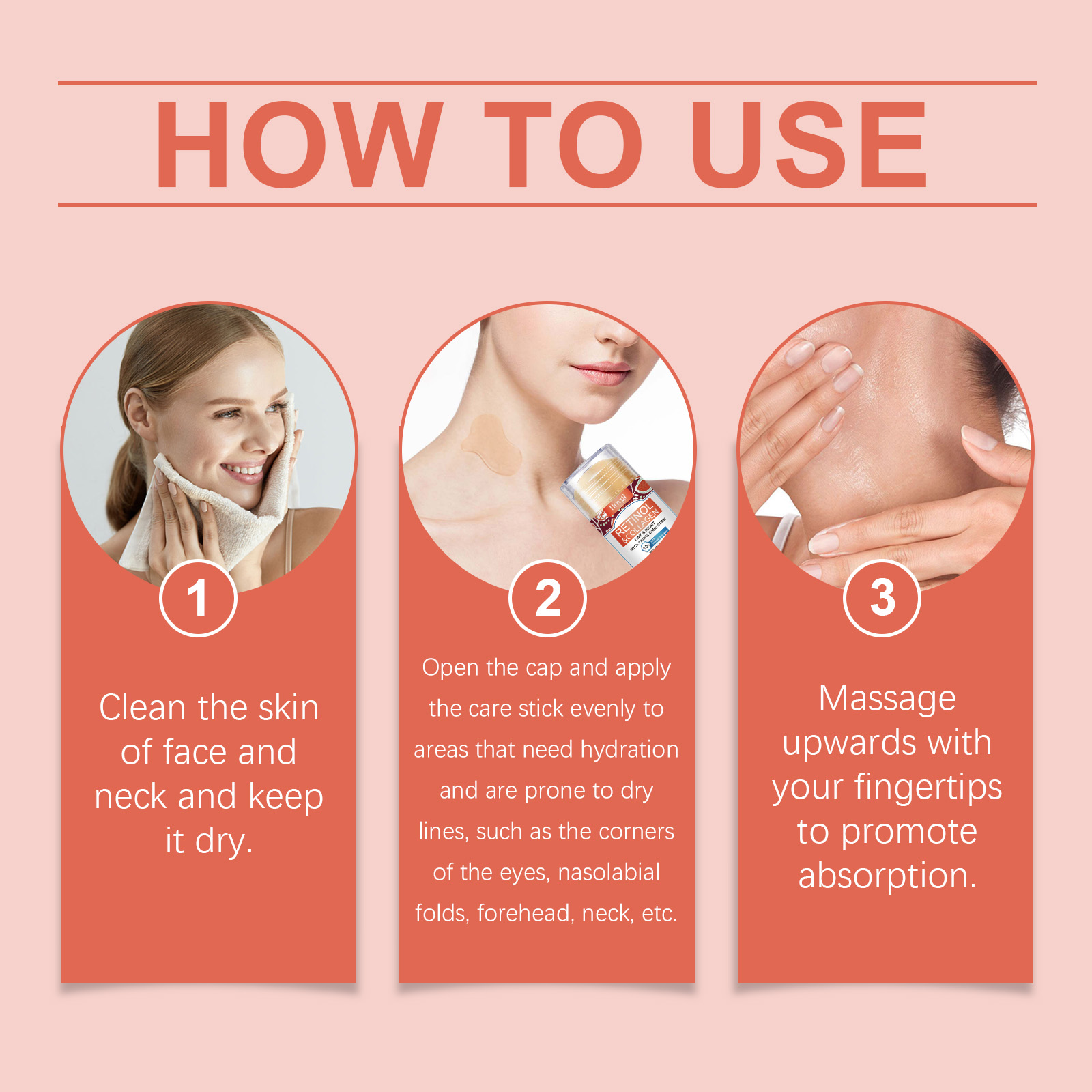 Our neck and face care stick is carefully formulated with jojoba seed oil, hyaluronic acid and collagen. Designed specifically to enhance skin elasticity and shape a firm contour. The usage method is extremely convenient: Clean the skin on the face and neck, keep the skin dry, open the lid, and evenly apply the hand guard to areas that need hydration and are prone to dry lines, such as the corners of the eyes, nasolabial folds, forehead, neck, etc. Massage from bottom to top with your fingertips to promote absorption. And it can deeply moisturize and improve dry skin.