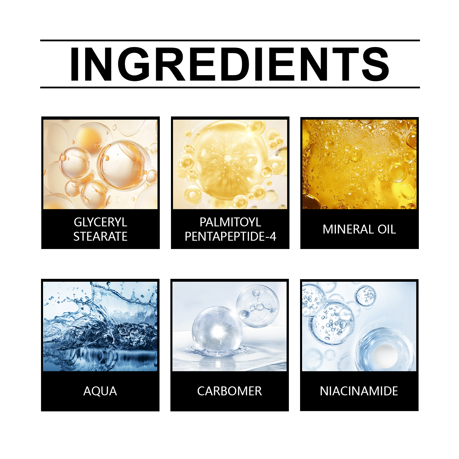 Our niacinamide firming and Smoothing Fine Line Eye cream contains carbomer, palmitoyl pentapeptide-4, and niacinamide. It protects the eye skin and reduces the effects of environmental stress. Improve loose skin around eyes and tighten skin. The way to use it is simple: 1. Clean your skin and keep it dry. 2. Apply appropriate amount of the product evenly around eyes or under eye bags; 3. Gently massage with fingertips until completely absorbed. Quickly improve the symptoms of eye strain. Transparent texture, comfortable experience. Enhances eye defense against everyday injuries.