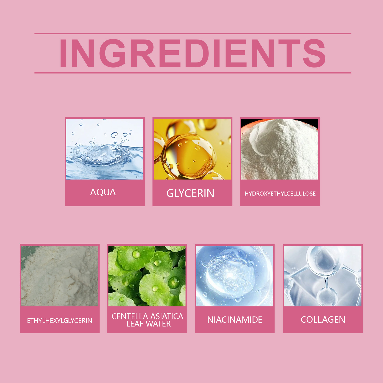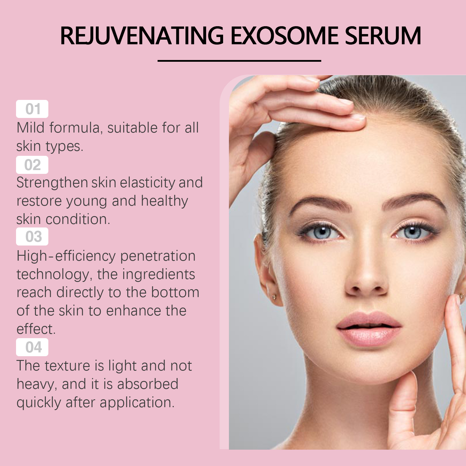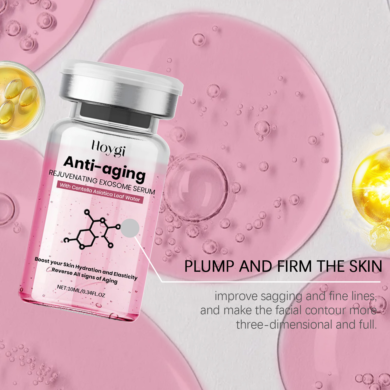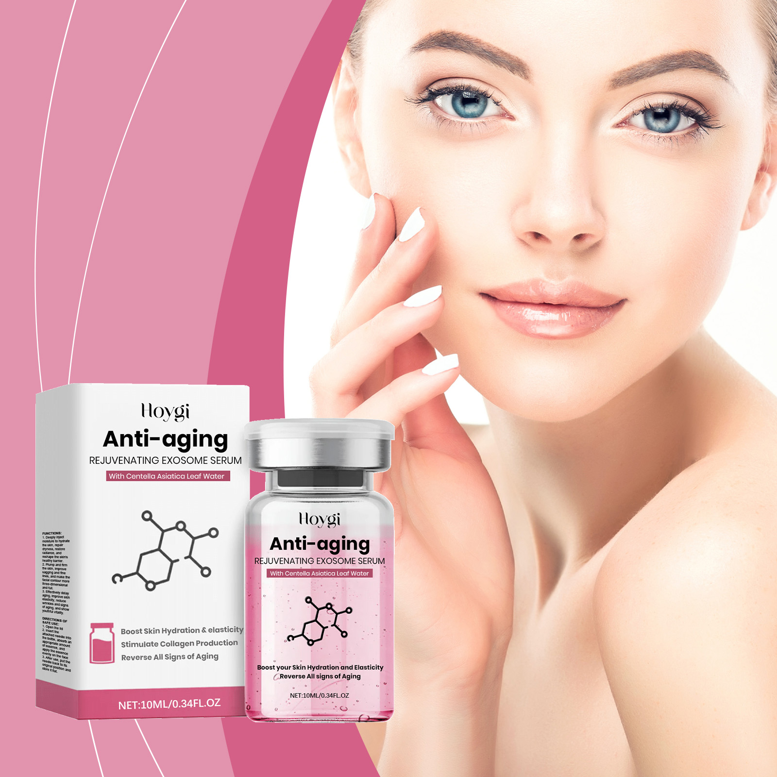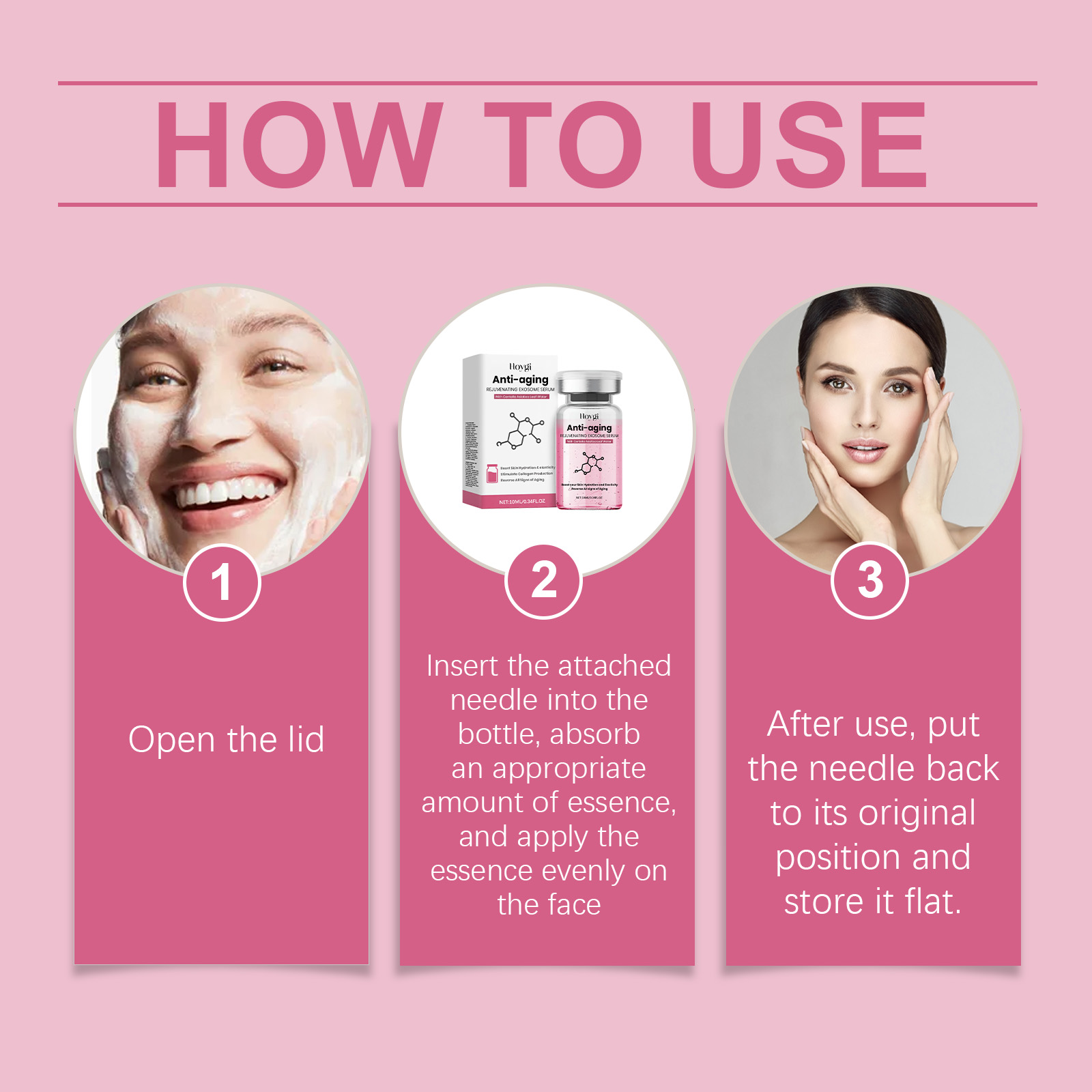 Our niacinamide serum contains snow leaf water, niacinamide, collagen. It can quickly relieve dry skin and leave skin soft and moist. The way to use it is simple: open the lid. Insert the attached needle into the bottle, absorb the appropriate amount of essence, and evenly apply the essence to the face. When you're done, put the needle back in place and store it flat. It can effectively improve loose skin and create a firm and full facial contour.