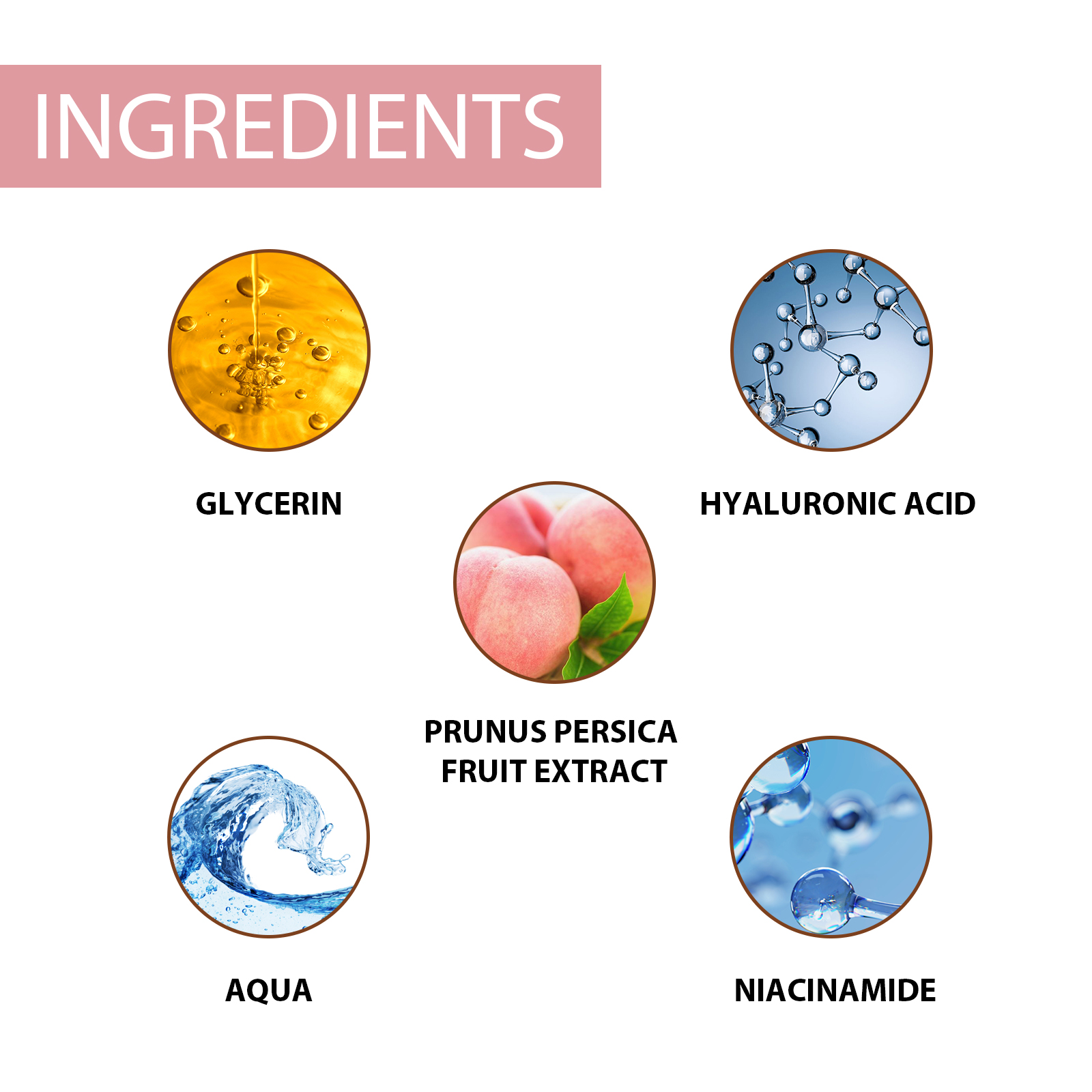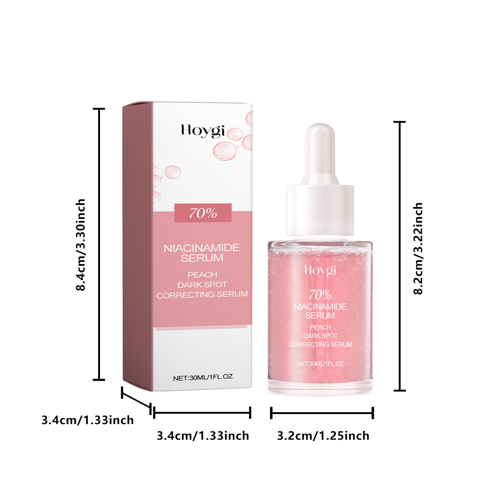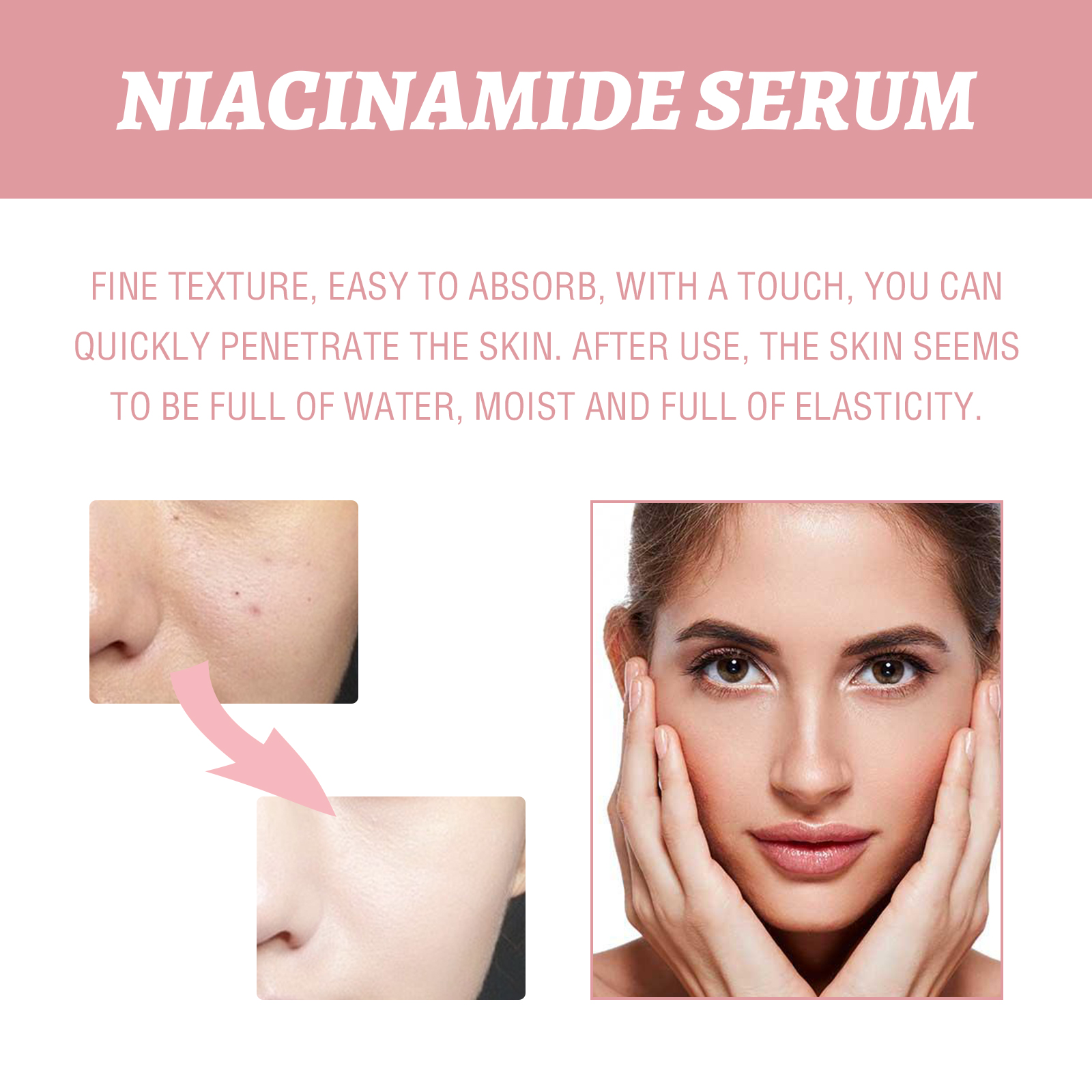Our nicotinamide serum contains hyaluronic acid, nicotinamide, and honey peach fruit extract. It can replenish skin moisture, improve dry skin, keep skin moisture, effectively regulate skin oil secretion, reduce pore blockage, make pores shrink naturally, and restore skin fine and smooth. Its application method is very simple: after cleaning the skin, take appropriate amount of this product in the palm, evenly apply to the face skin, massage along the cheeks until the essence is completely absorbed. Can penetrate the skin quickly, after use, the skin seems to be full of water, moist and elastic.