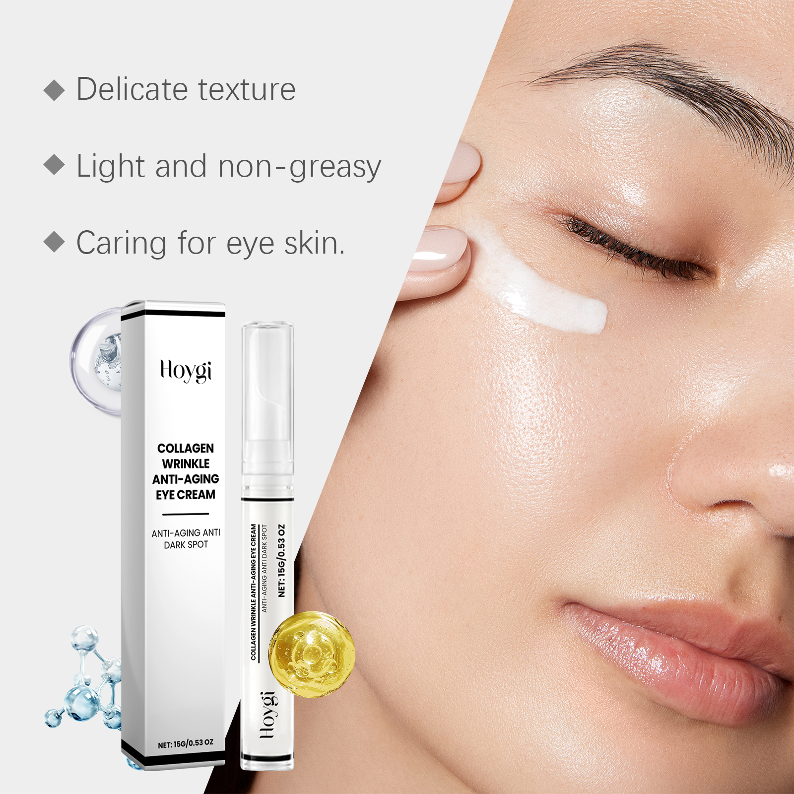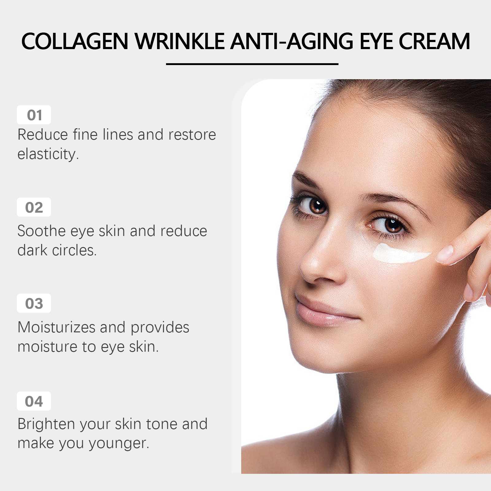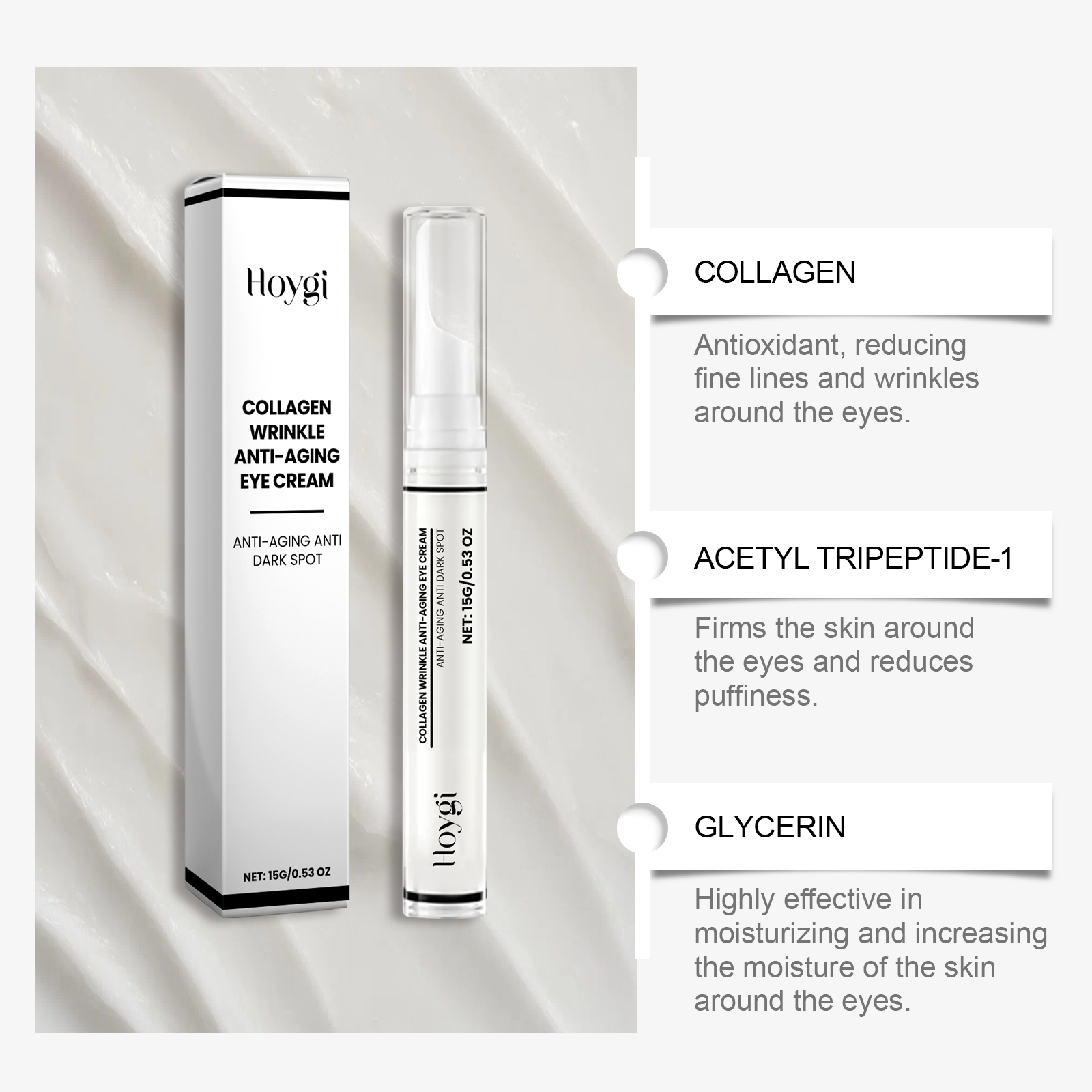 Our nourishing eye cream contains collagen, acetyl tripeptide-1, and glycerin. It can penetrate deep into the skin and effectively reduce fine lines and wrinkles. Enhance the elasticity of the eye skin, tighten the eye bags, improve the dark circles. Its application is simple: 1. Thoroughly clean and dry the skin around the face and eyes. 2. Apply proper amount of this product to the skin around eyes. 3. Gently massage until completely absorbed. Lighten the dullness around the eyes, lighten the skin tone, and recreate the bright and attractive eyes. Deep moisturizing, improve dry skin, leave skin soft and moist.