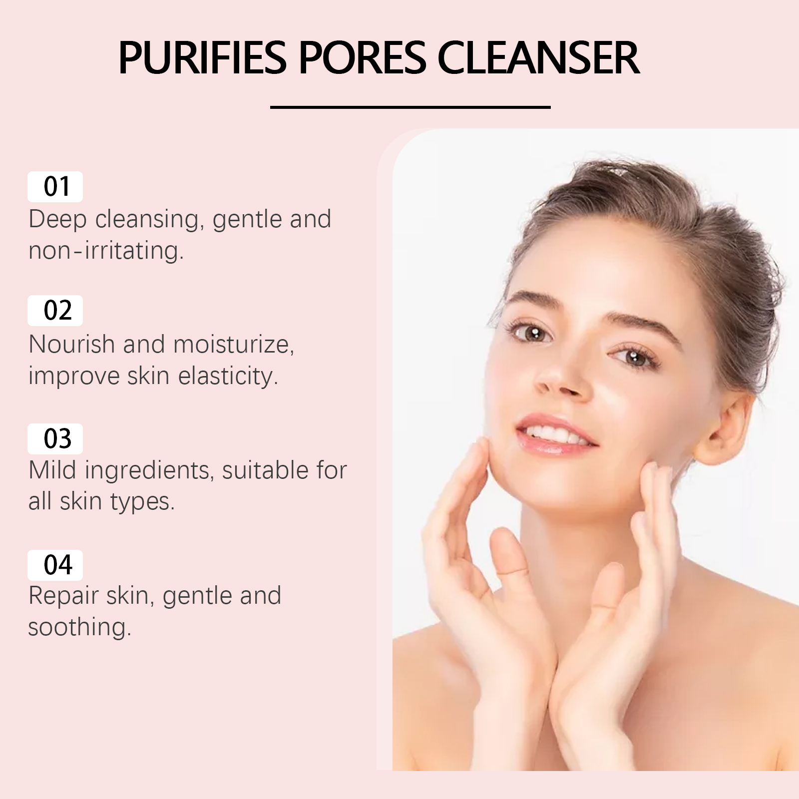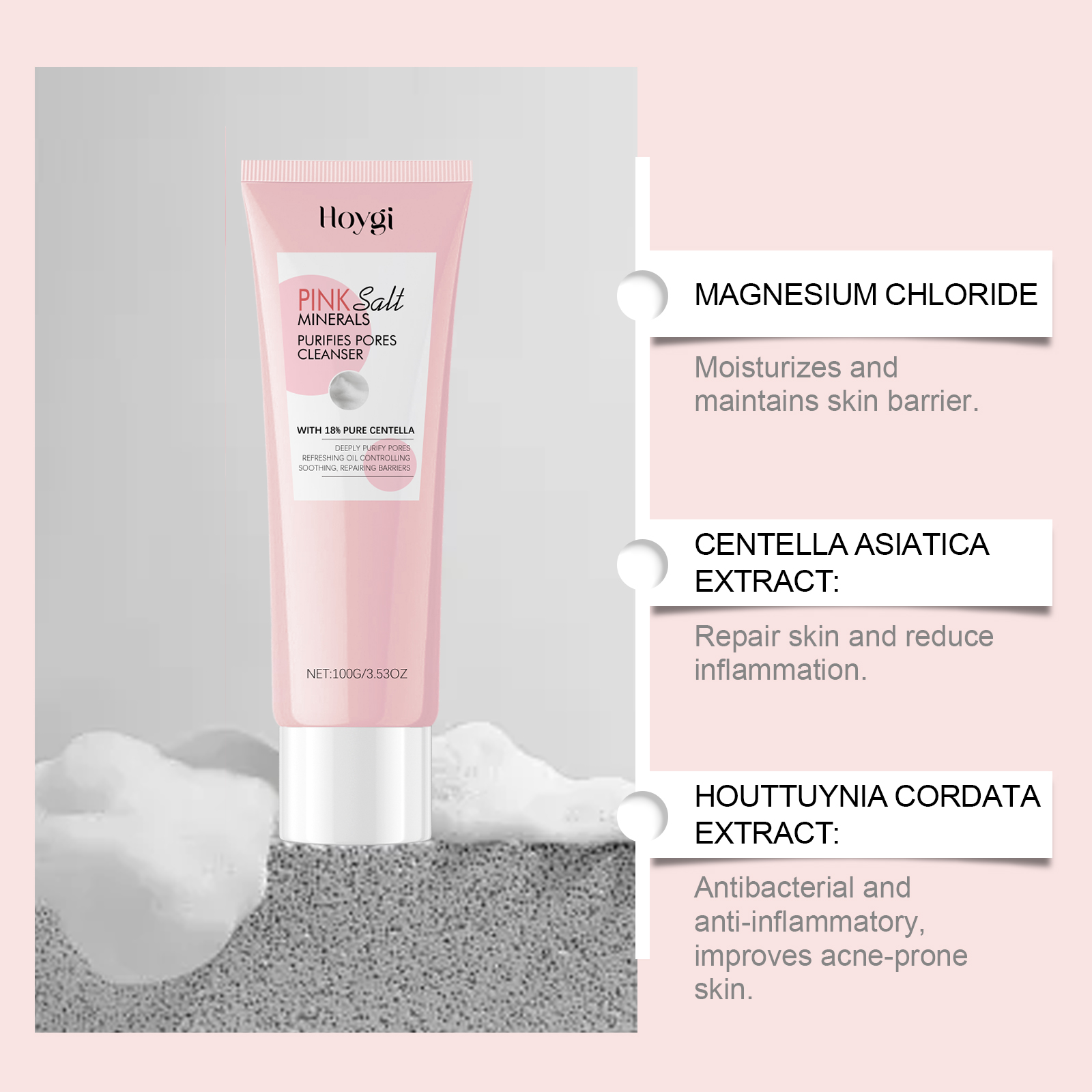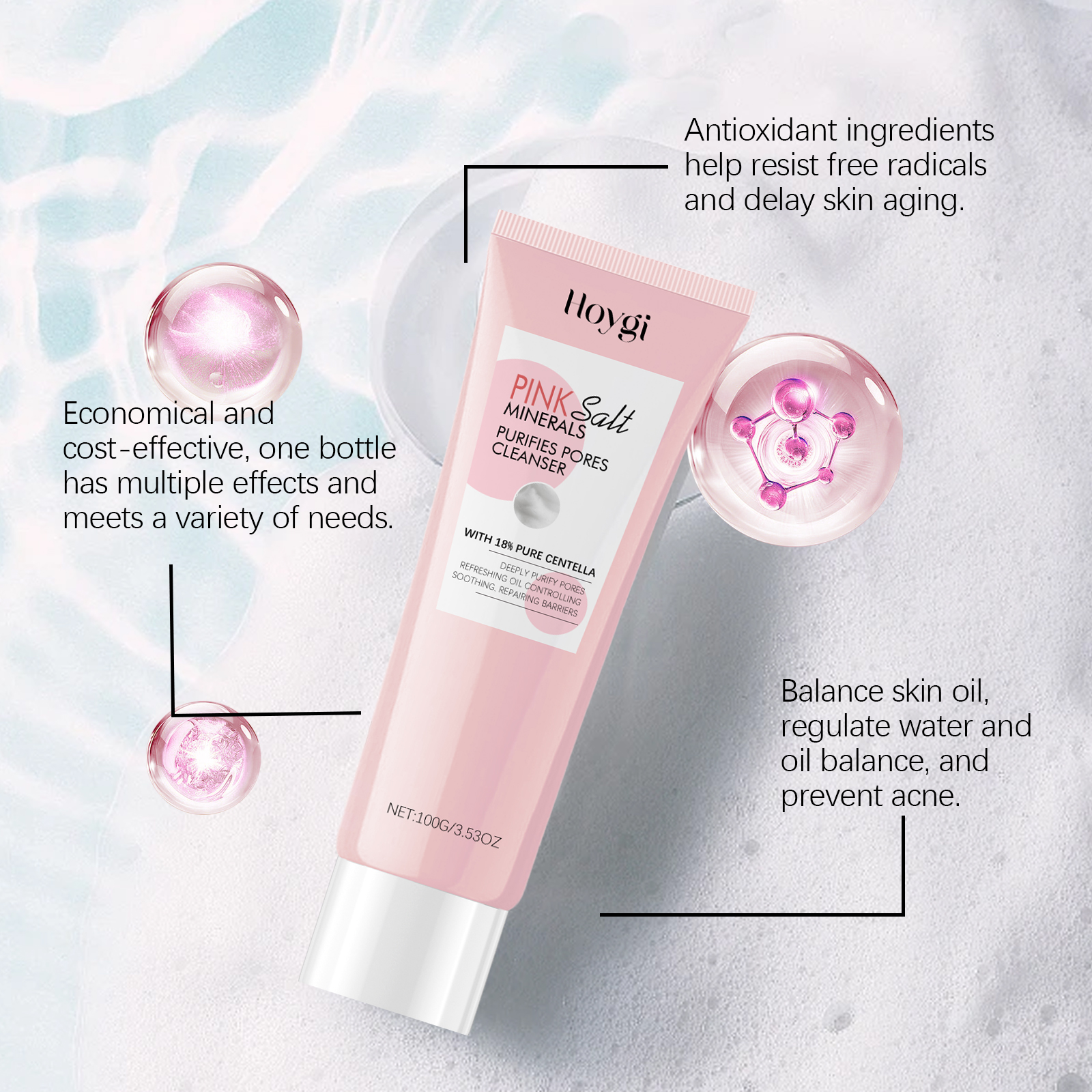Our pore cleansing cleanser contains magnesium chloride, Asiaticum extract, Houttuynia extract. It can effectively clean the surface of the skin dirt and impurities, keep the skin fresh. Its use method is very simple: 1. First, moisturize the facial skin; 2. Take appropriate amount of this product in the palm and rub into the foam, evenly apply on the face; 3. Gently massage your face and rinse thoroughly with warm water. Penetrate deep into pores to remove excess oil and dirt and prevent clogged pores.