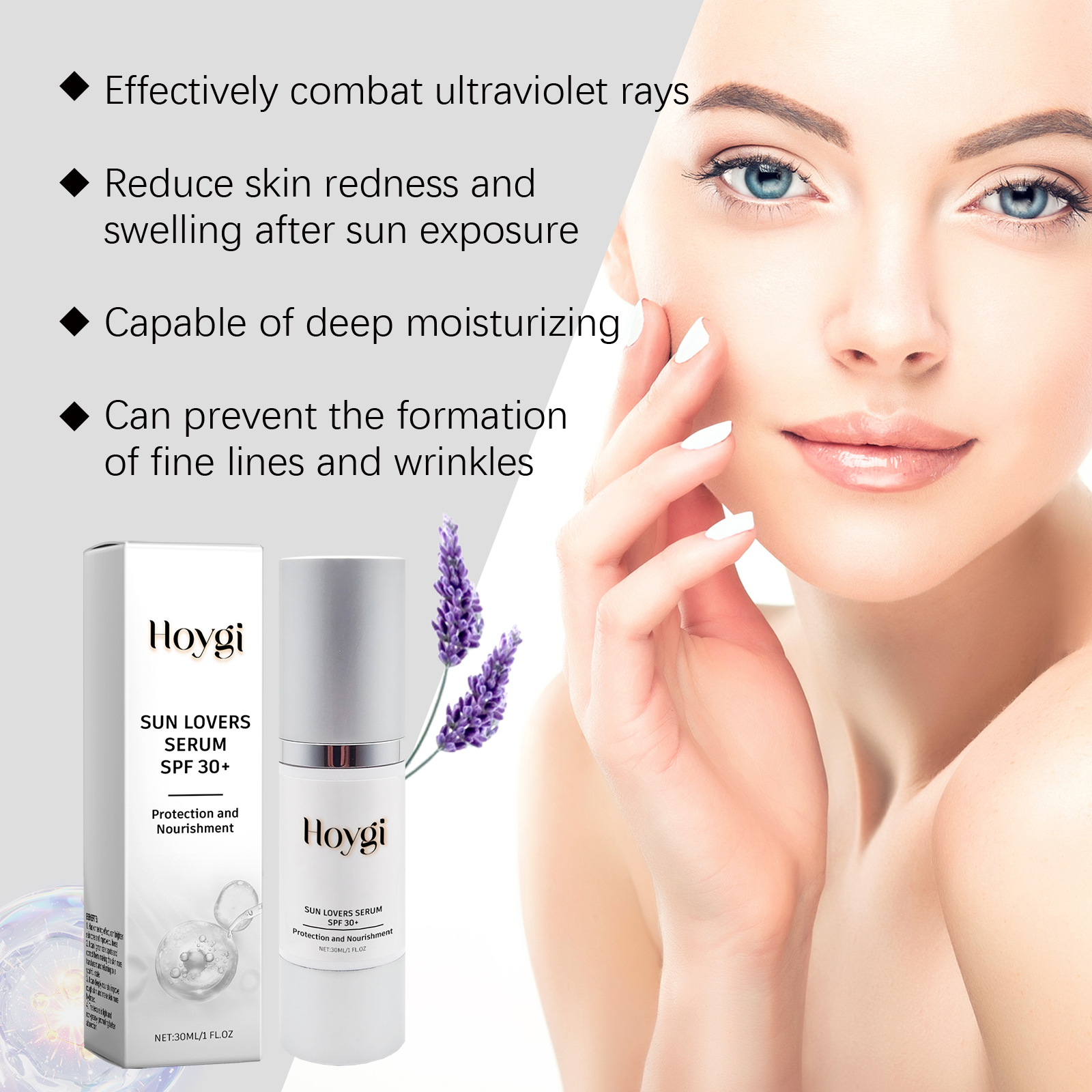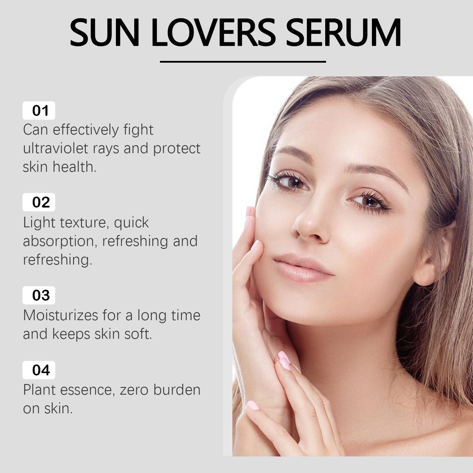 Our protective essence lotion contains lavender extract, sandalwood extract. It can make your skin healthier, smoother, and improve the makeup fit. Its application method is very simple: 15-20 minutes before going out, evenly apply the sunscreen serum to the parts of the face that need sunscreen, massage until completely absorbed, wait for the film to form, if you need to apply makeup, please use before makeup. If you are exposed to the sun for a long time, you need to reapply every 2-3 hours. And can reduce redness discomfort, maintain skin balance.