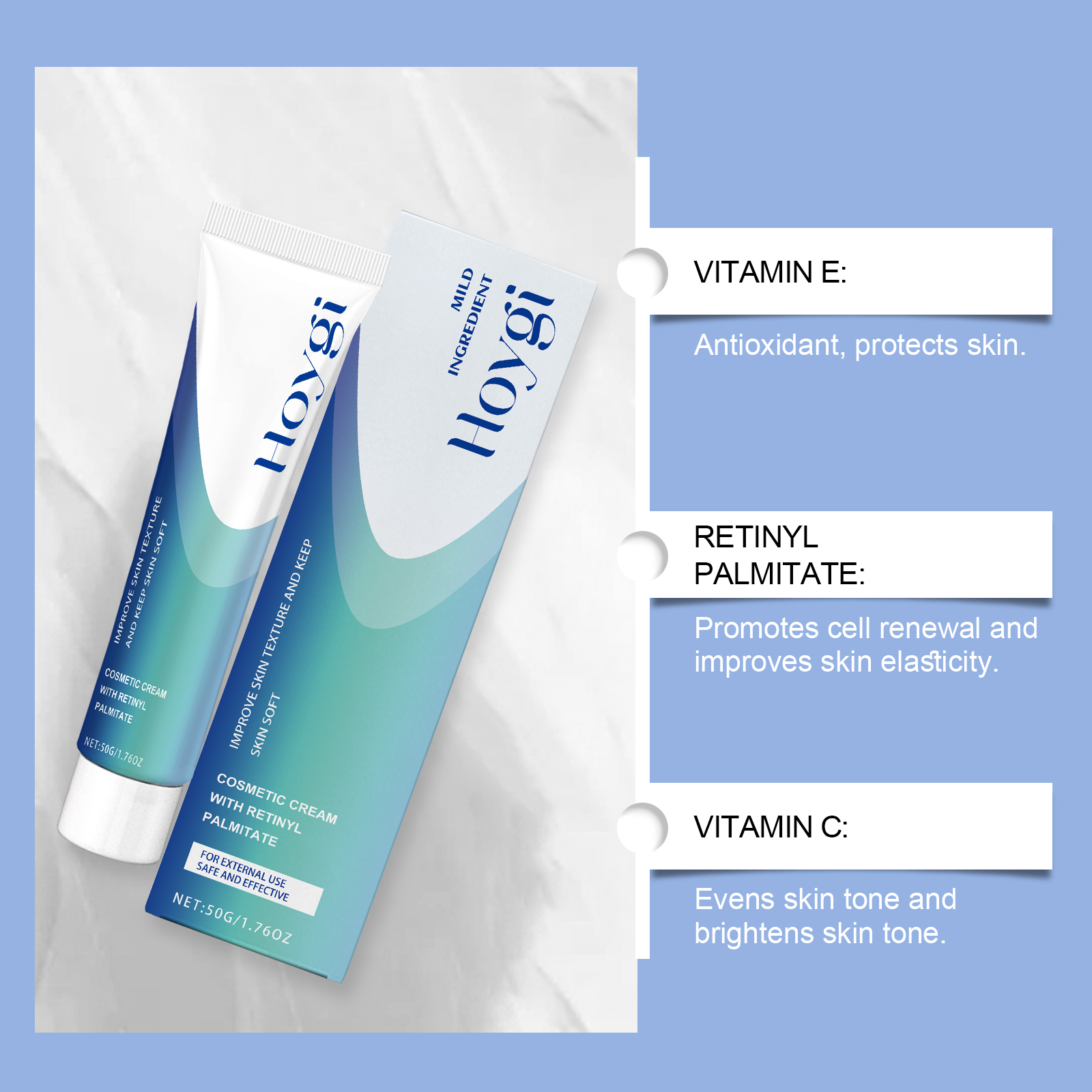 Our retinol creams contain retinyl palmitate, tocopherol (vitamin E), ascorbic acid (vitamin C). It can effectively combat skin aging. Deep lock water, continuous moisture. Its use is simple: 1. It helps stimulate collagen production, improve skin texture, delay aging, and keep you young. 2. It can help remove pigment and make your face white and shiny. 3. Light texture, can be quickly absorbed by the skin, fresh and not greasy after use. Safe and gentle, care for every inch of skin. Enhance skin elasticity, say goodbye to flabby, forever youth.
