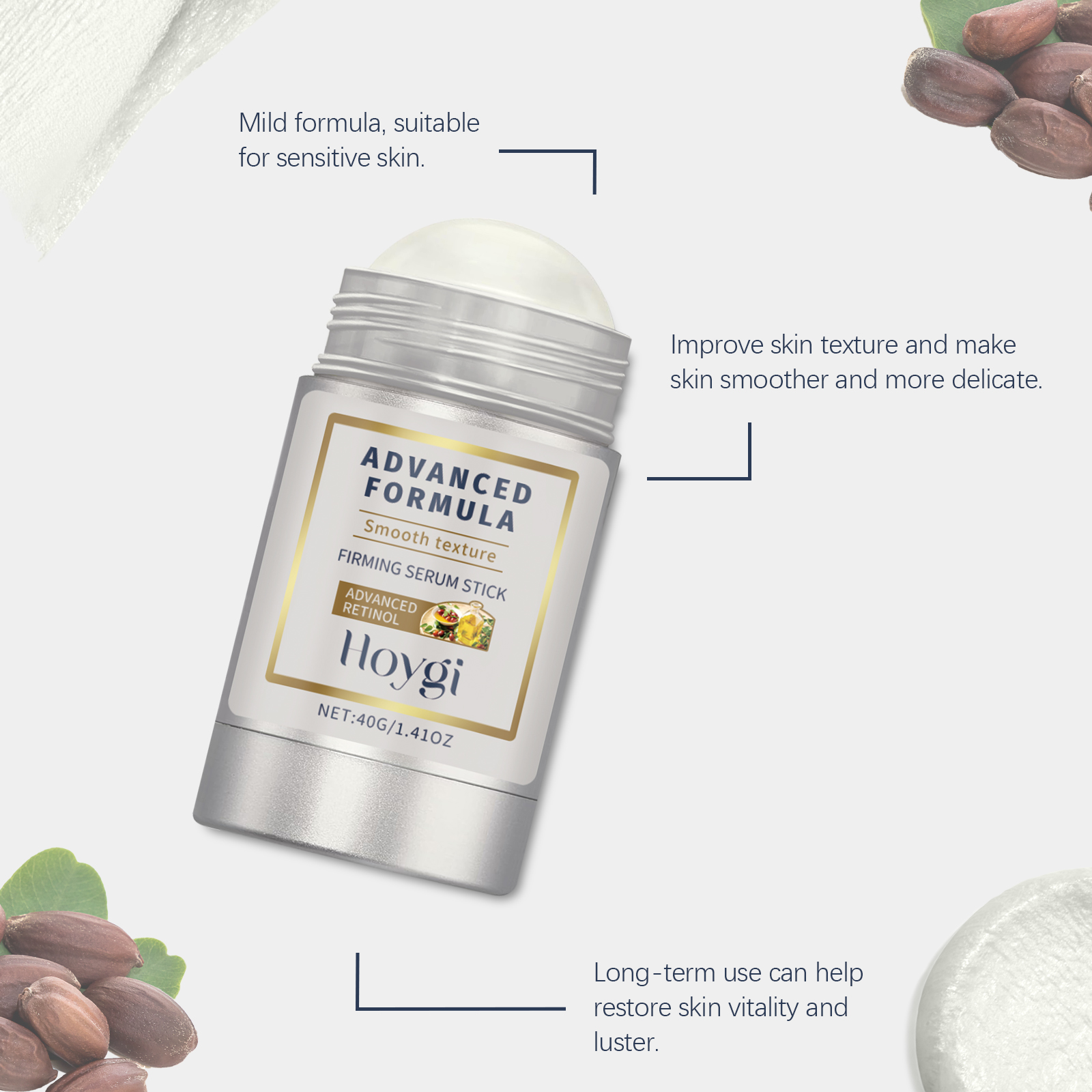Our retinol face firming bar contains hyaluronic acid, camellia extract, and niacinamide. It can even skin tone, lighten skin tone, reduce dullness; Antioxidant, helps to improve skin tone and shine. Promote cell renewal, reduce fine lines, anti-aging. Its application is simple: 1. Clean your skin and pat dry to keep it dry. 2. Evenly apply the serum to the parts that need to be tightened, such as the jaw, neck, forehead, etc. 3. Gently massage the skin to promote absorption. Highly effective ingredients help improve skin firmness and relaxation. Hyaluronic acid provides strong moisture and keeps skin hydrated.