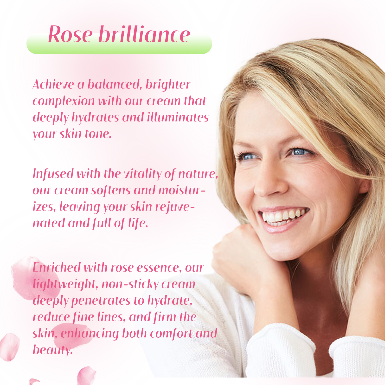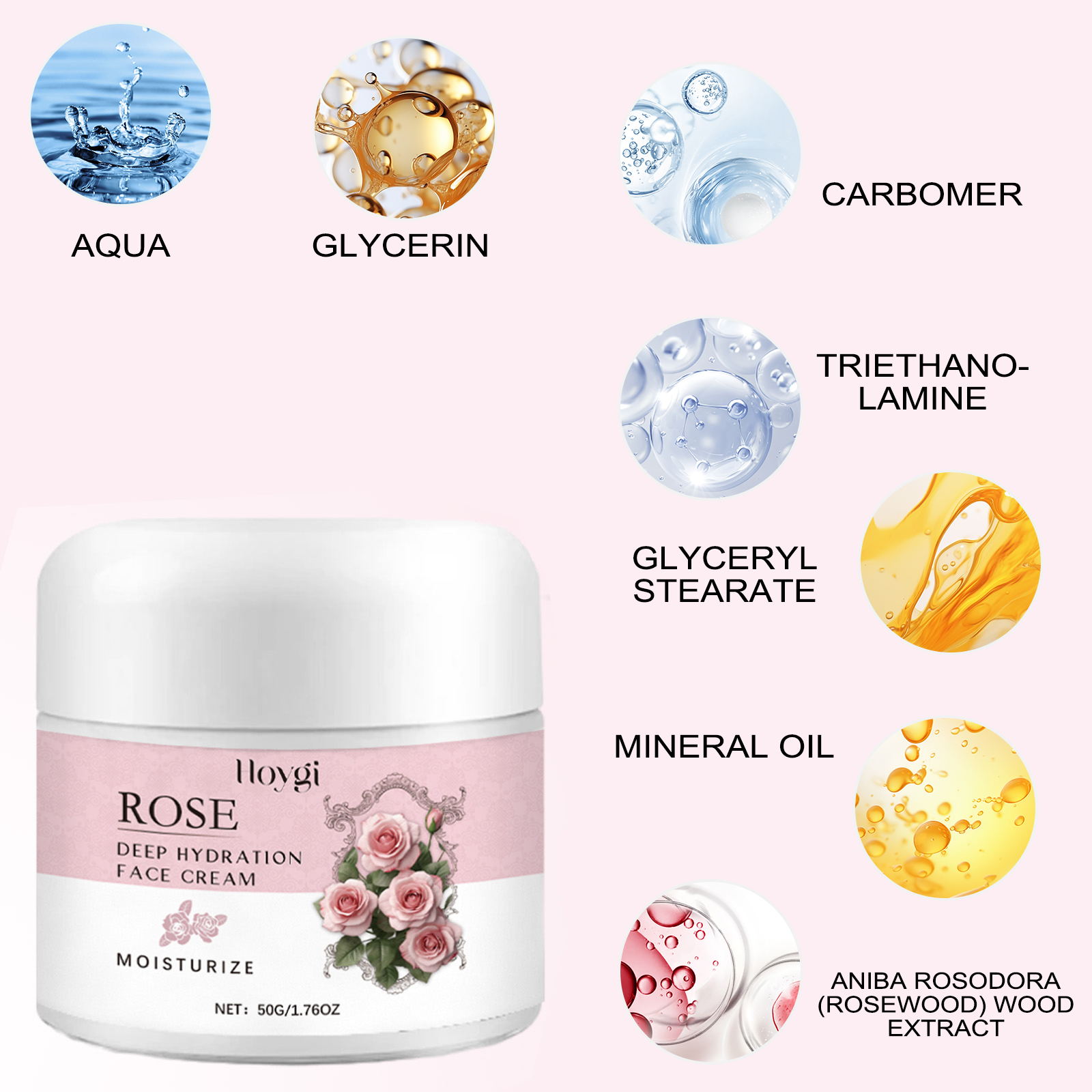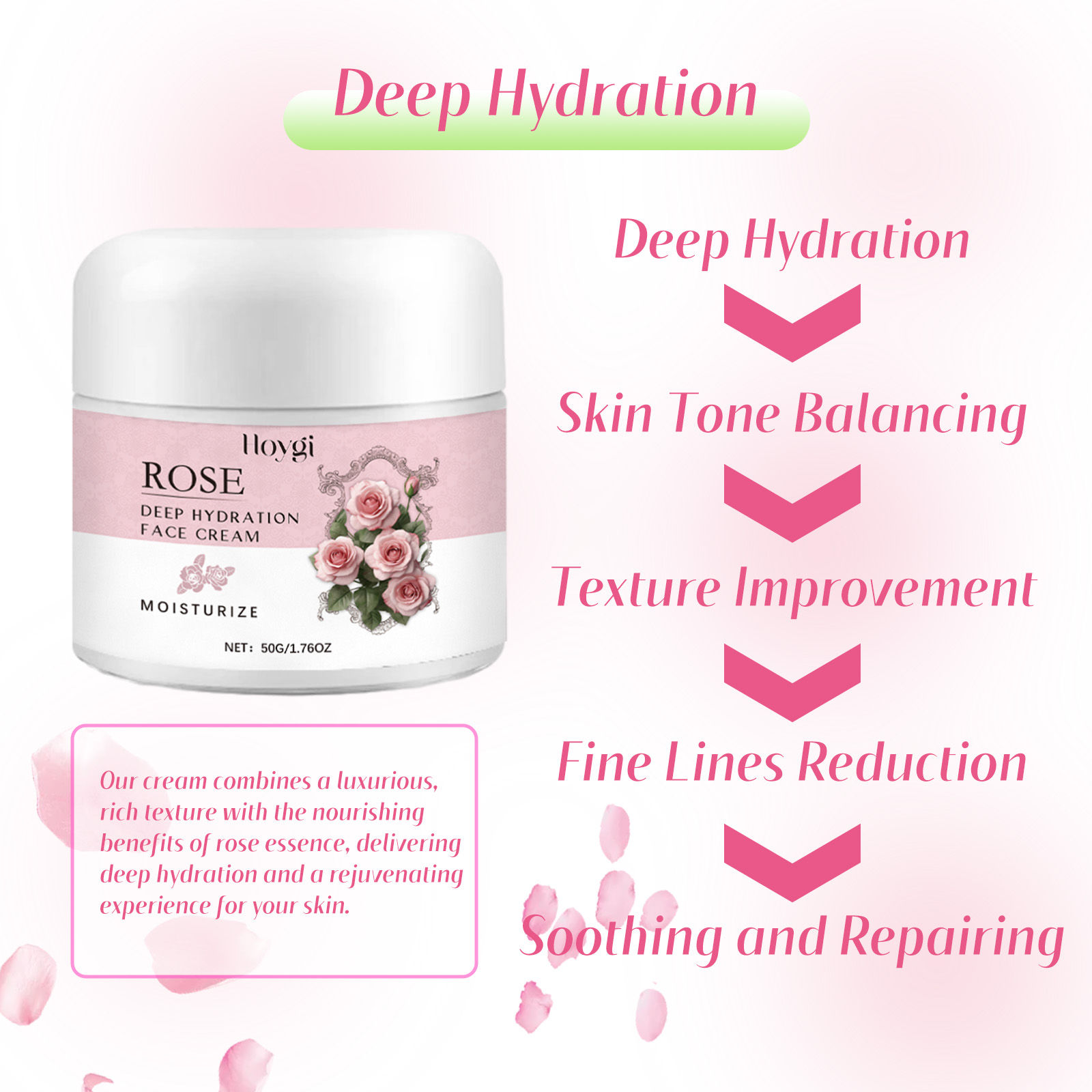 Our rose moisturizing cream contains mineral oil and glycerin. It can 1. Soft and moisturize the skin, make the skin full of vitality; Rich in rose essence, it can penetrate deep into the skin, improve dry skin, help fade fine lines, and tighten skin. Deep hydration, effective against dryness and dehydration, making skin smoother, more delicate, natural glow; Skin tone balance, fine line reduction, soothing and repair. Its use method is very simple: after cleansing, take a proper amount of cream evenly apply to the skin, gently massage until absorbed. Rose Moisturizer deeply hydrates and illuminates your complexion for a balanced, bright complexion; Infuse the vitality of nature to effectively soften and moisturize, leaving your skin rejuvenated and full of vitality; Contains rose essence, light texture, non-sticky, deep penetration and moisturizing, fade fine lines, firm skin, comfortable and beautiful.