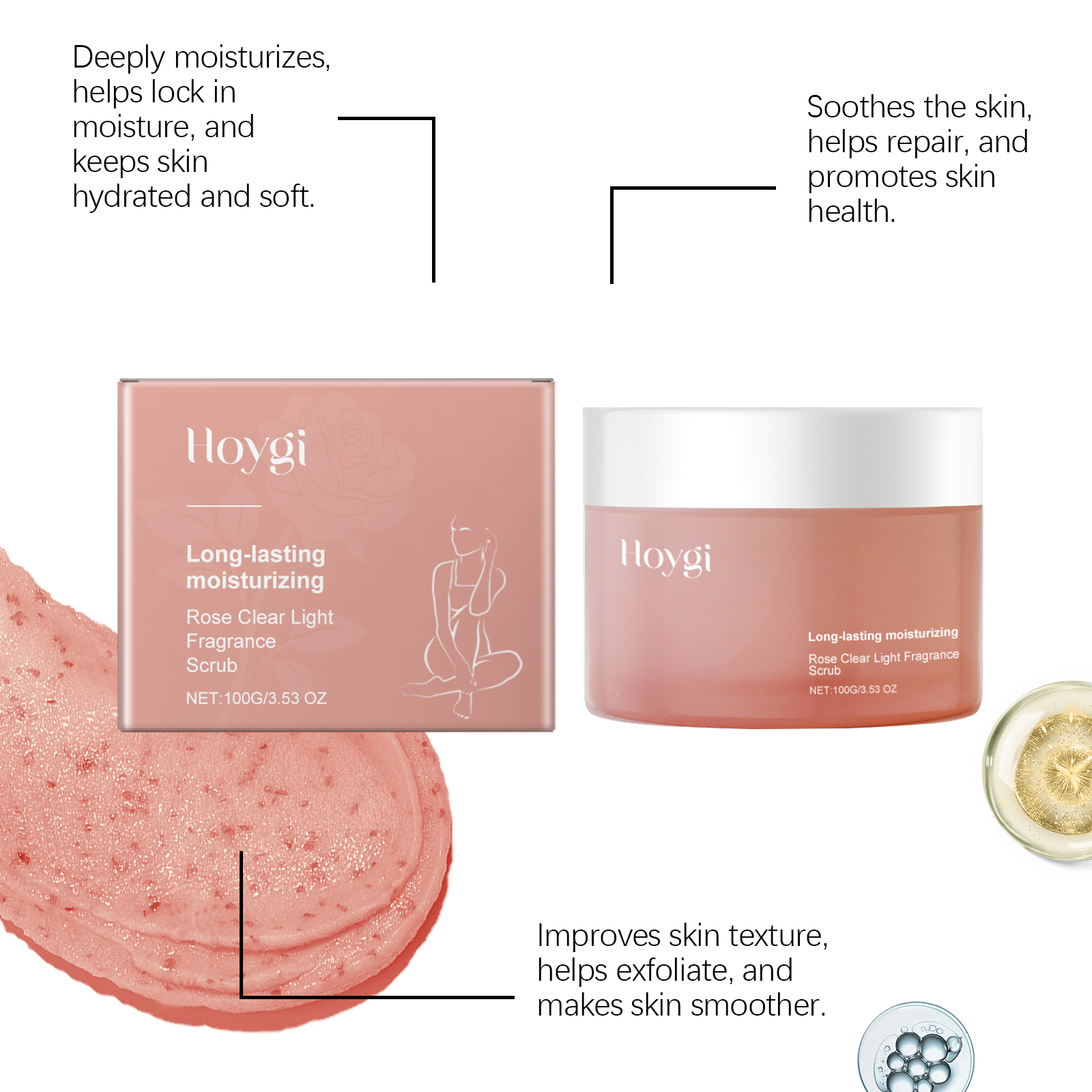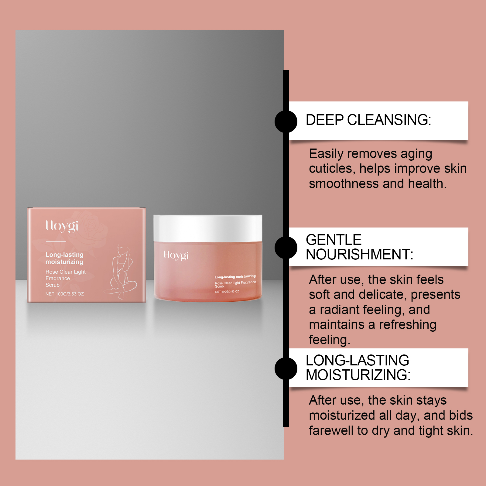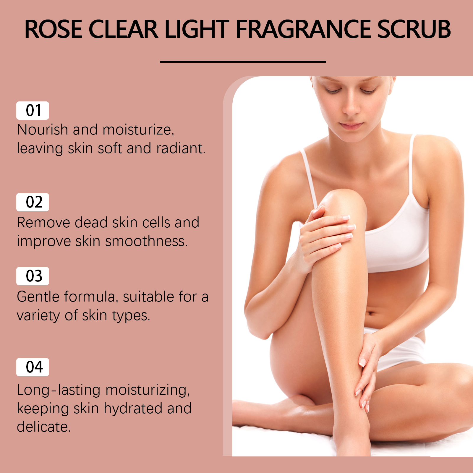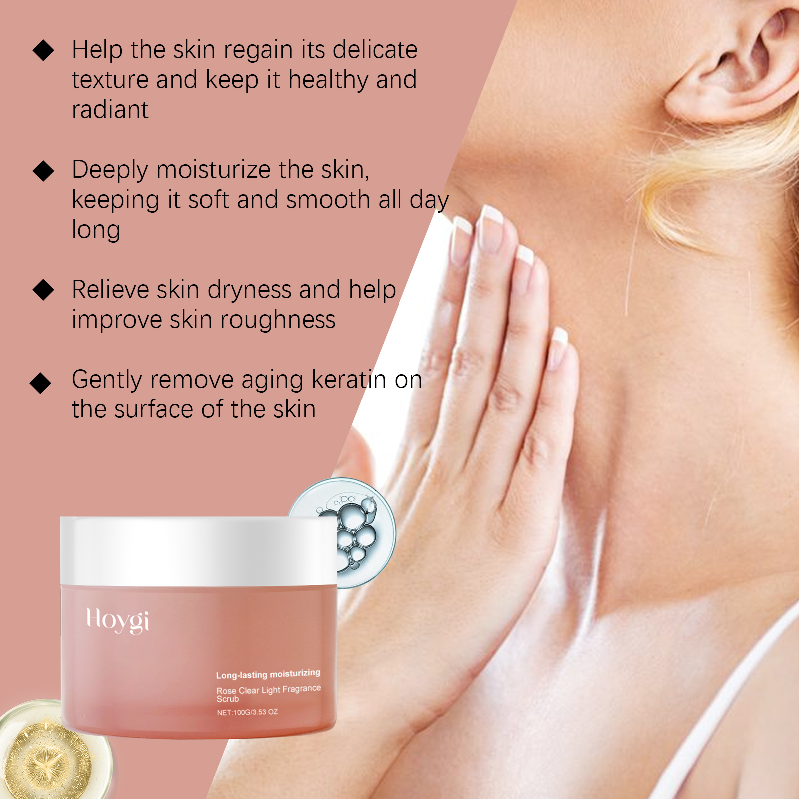 Our rose scrub contains glycerin and rose extract. It moisturizes skin care and helps keep skin soft and elastic. Easy to apply, fresh and non-stick, soft skin, no residue after use. Its use method is very simple: take a proper amount of clean and dry facial cleanser evenly apply to the face. It can also improve the overall feel and appearance of the skin, making it softer and more delicate. The product is easy to use, simple and efficient, and is essential for daily care.
