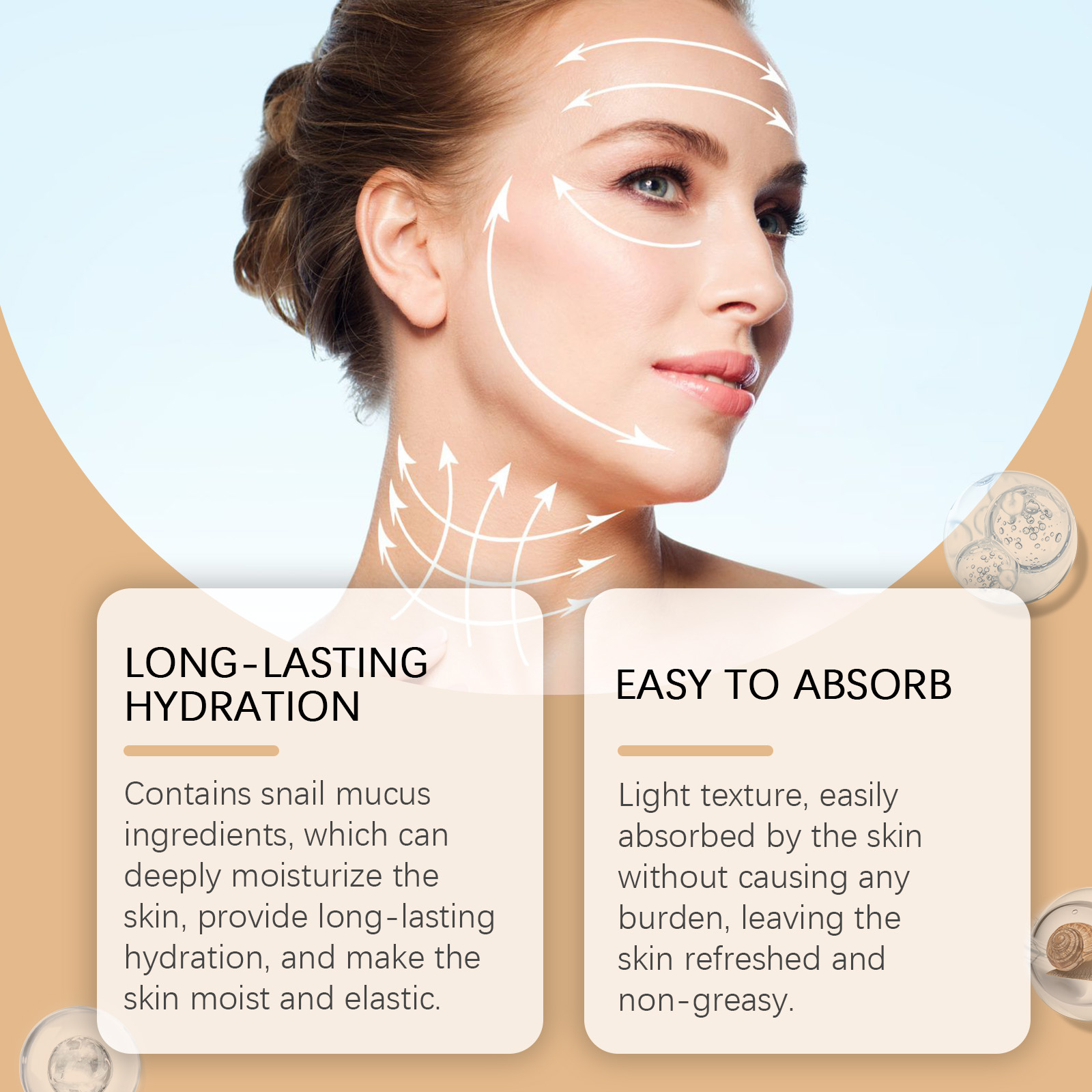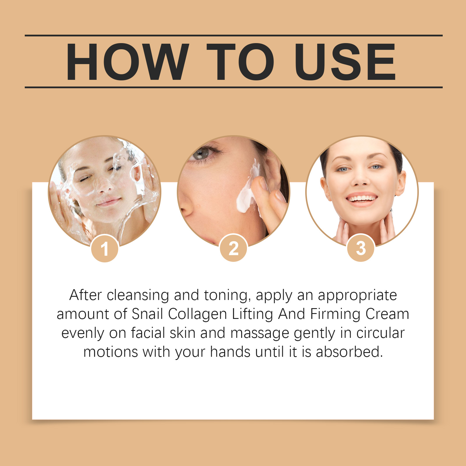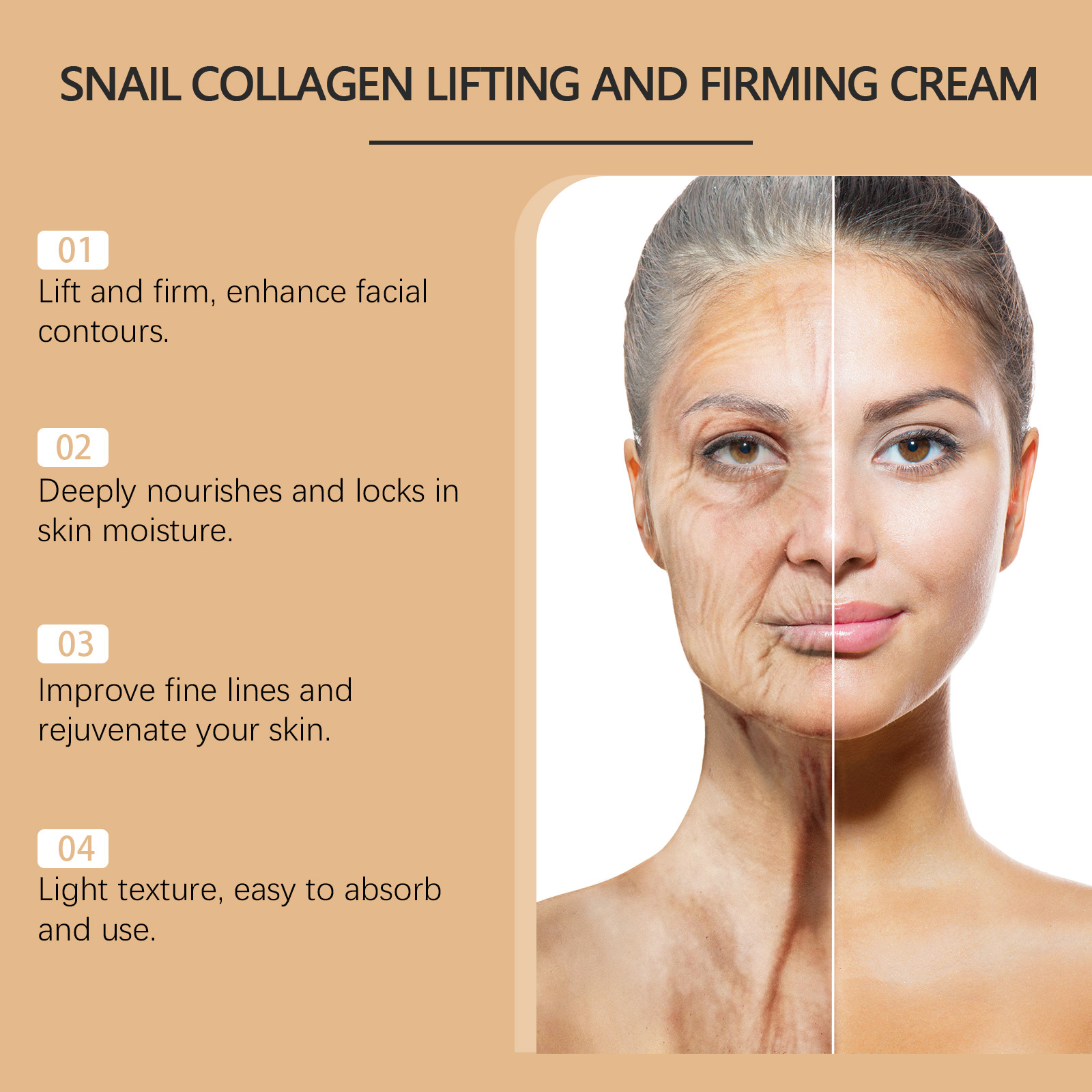Our snail collagen firming cream contains hydrolyzed collagen, snail secretion filtrate and hyaluronic acid.Our snail collagen firming cream contains hydrolyzed collagen, snail secretion filtrate and hyaluronic acid. It can deeply moisturize the skin, provide long-lasting hydration, and make the skin moist and elastic. The application method is very simple: after cleansing and toning, take an appropriate amount of snail collagen firming and lifting cream and evenly apply it to the facial skin. Then, use your hands to gently massage in circular motions until it is fully absorbed. The texture is light and easy to be absorbed by the skin, without causing any burden and leaving the skin feeling fresh and not greasy.