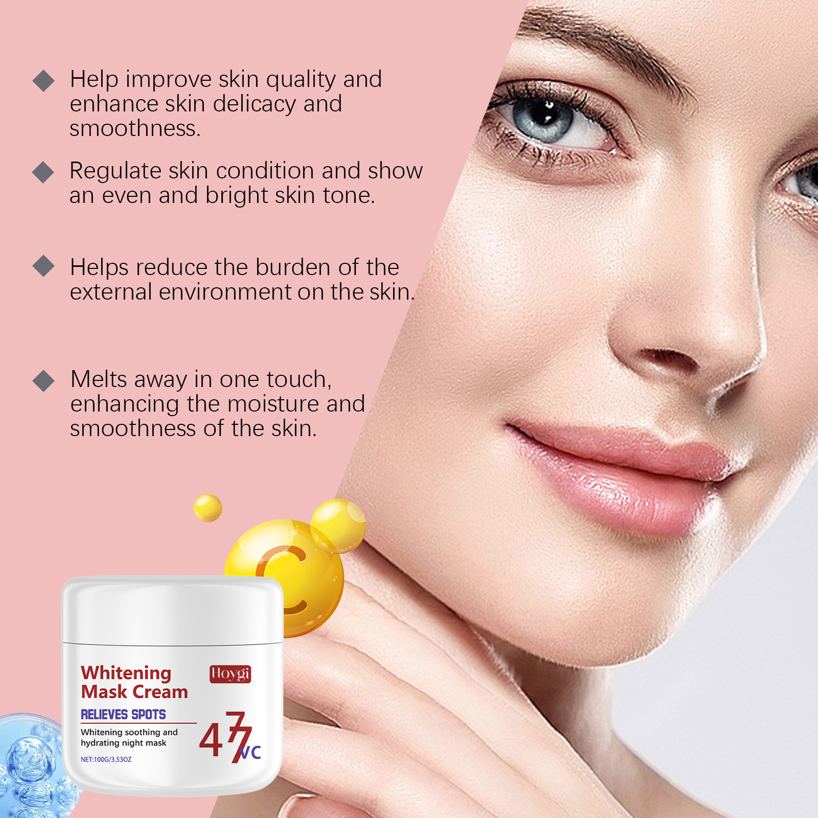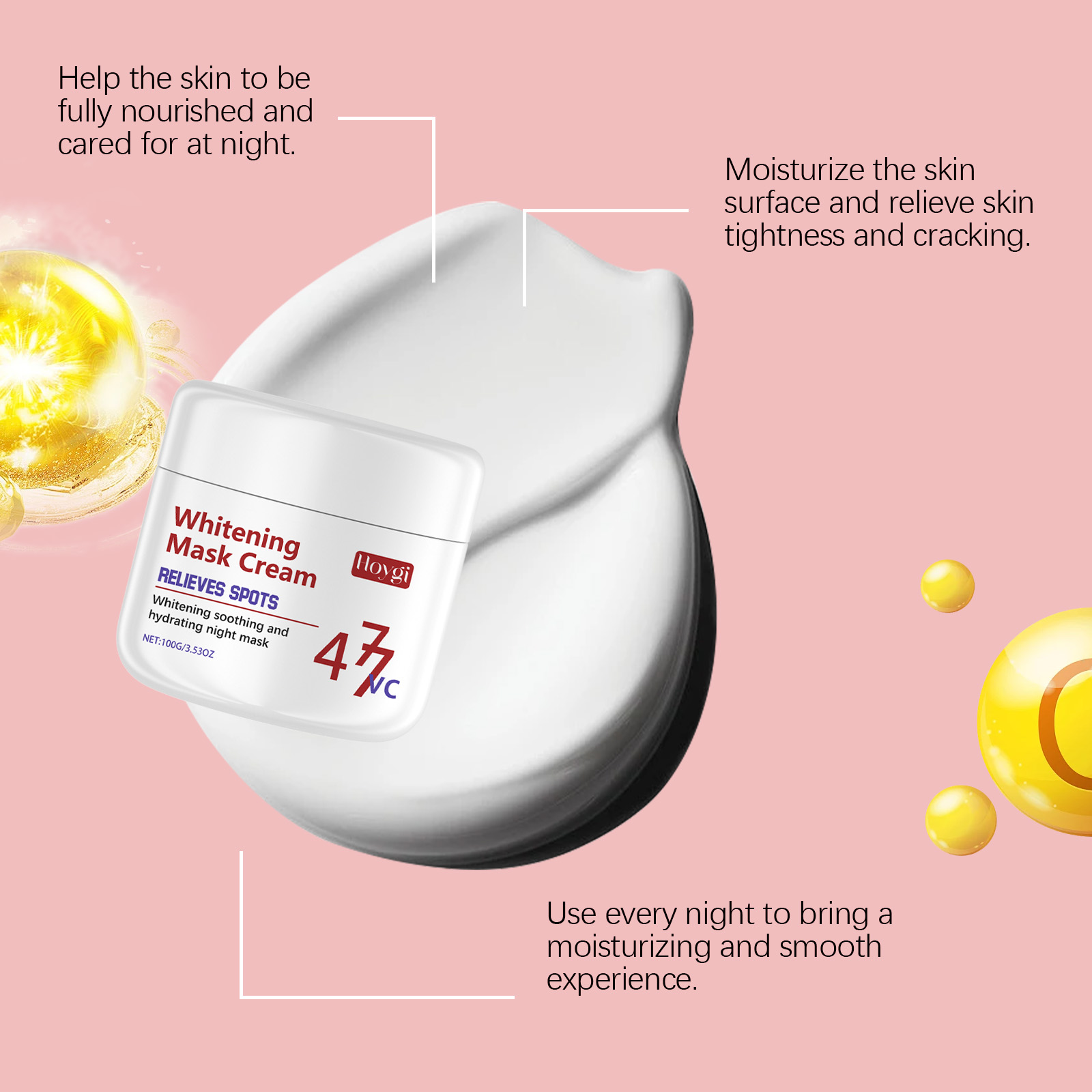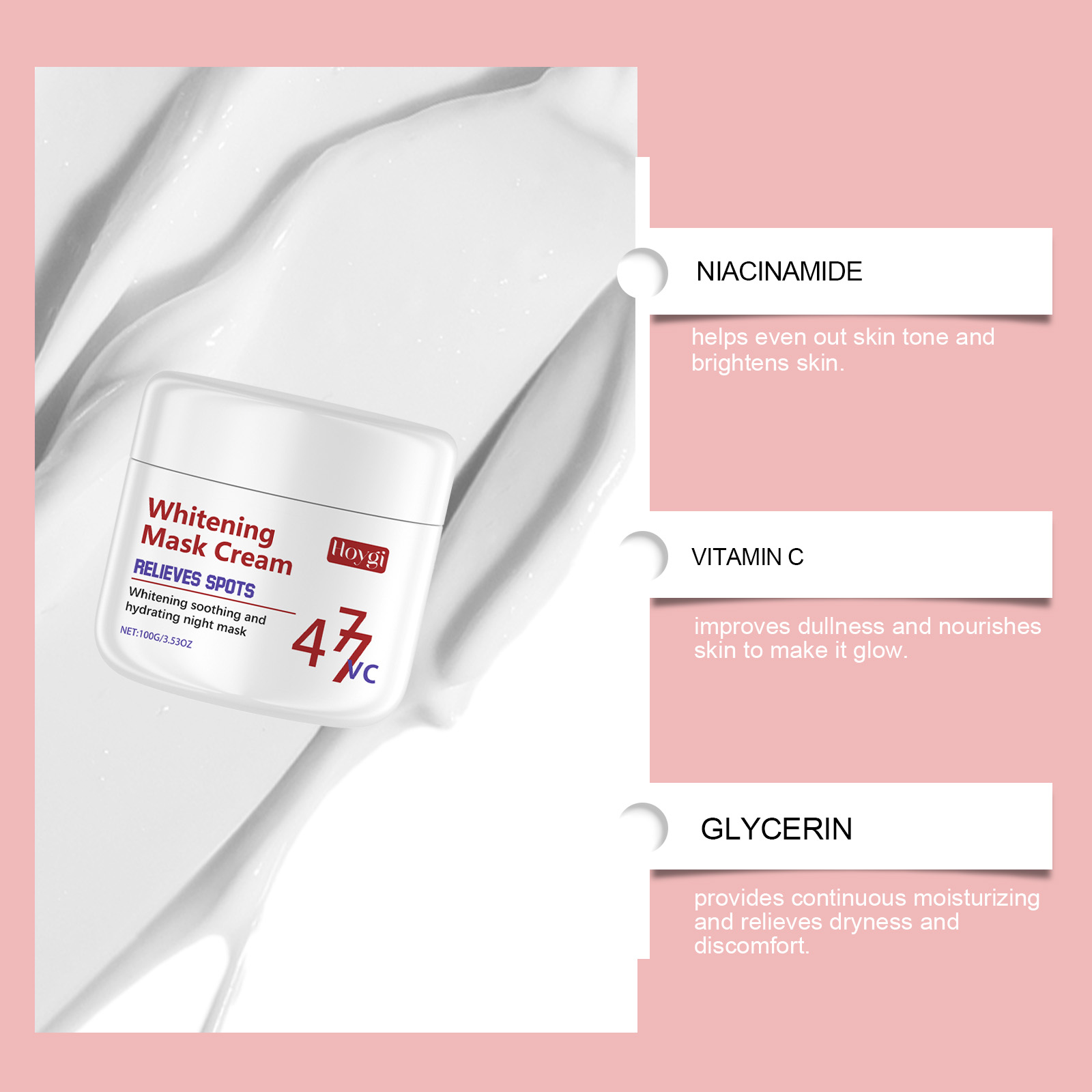 Our soothing and moisturizing Sleeping mask contains hydroxyethylcellulose, niacinamide, Vitamin C (ascorbic acid). It can deeply nourish, release repair power at night, and leave skin hydrated and smooth. Its use method is very simple: after cleansing before going to bed, take appropriate amount of this product evenly spread on the face. When you wake up, wash with clean water. And can help improve the dull skin tone, show the skin luster.