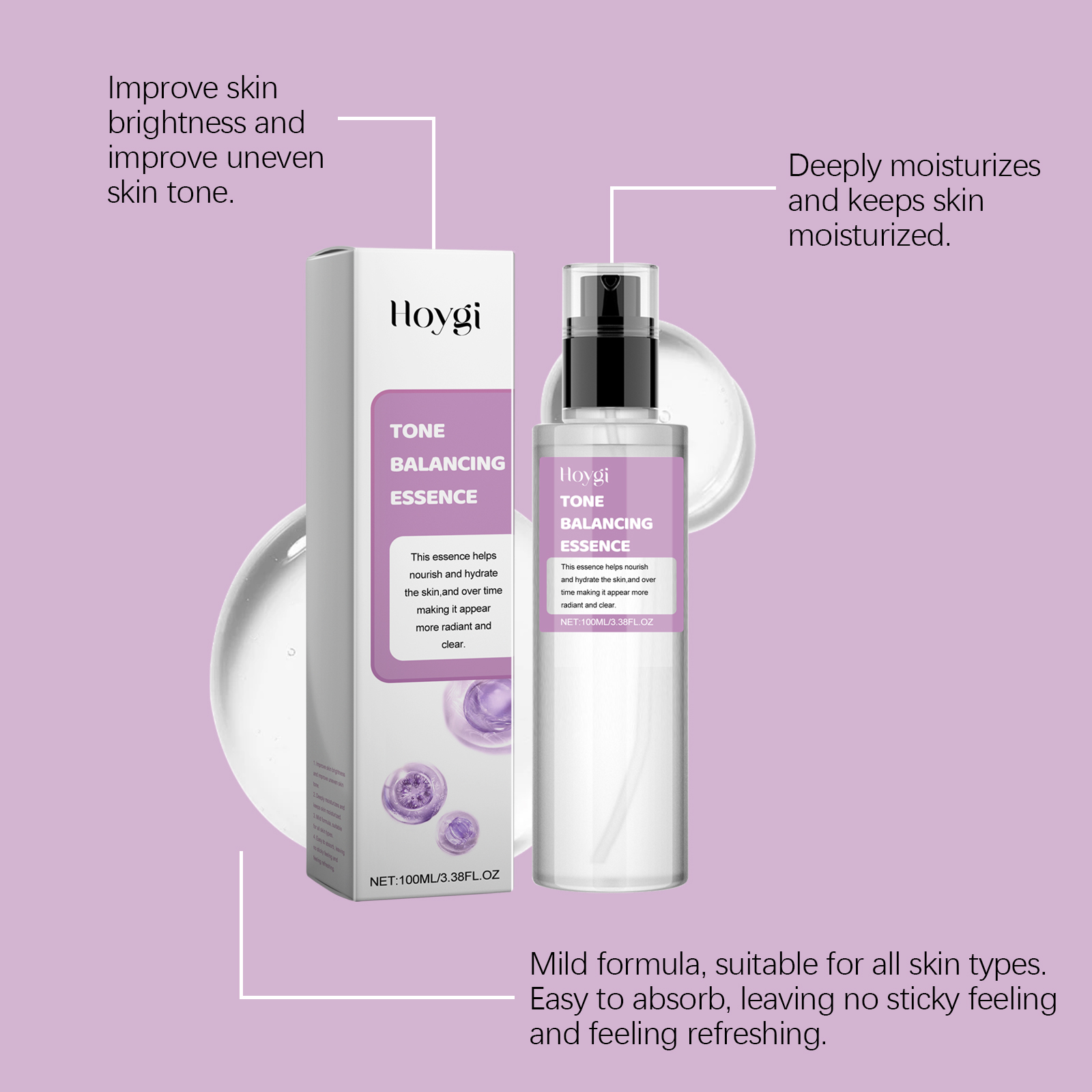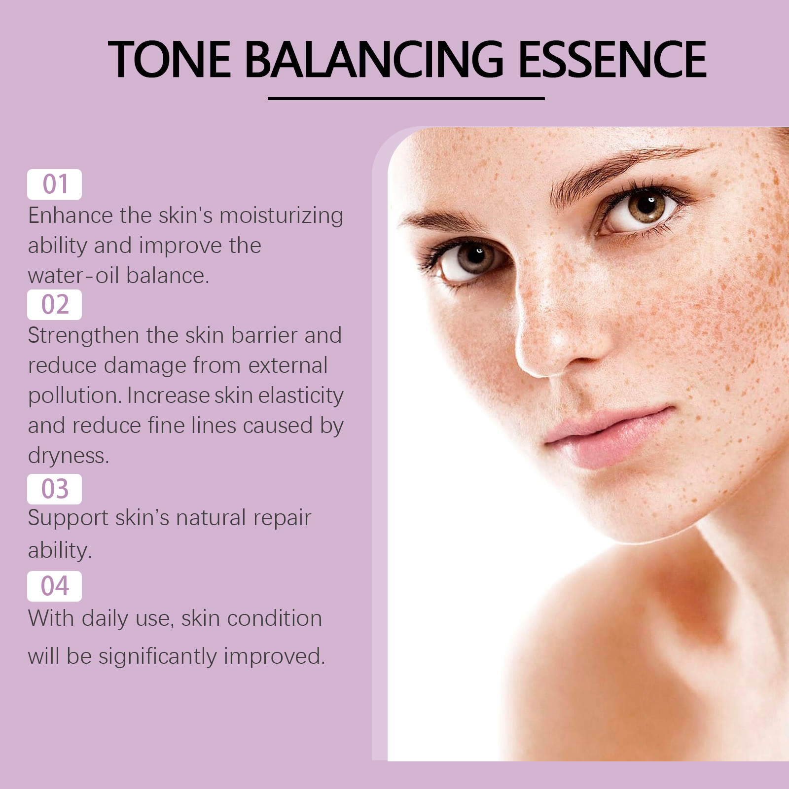 Our Tone Balancing Essence contains Niacinamide, Hyaluronic Acid, Hamamelis Virginiana Extract. It can enhance the moisturizing ability of the skin, improve the balance of water and oil, strengthen the skin barrier, and reduce the damage of external pollution to the skin. Increase skin elasticity, reduce fine lines caused by dryness, and support the skin's natural healing ability. Its application method is very simple: clean facial skin, keep dry, apply appropriate amount of this product evenly on facial skin, gently massage until completely absorbed. Can help reduce facial pigmentation, improve uneven skin tone, make your face look more shiny, can help smooth skin texture reduce fine lines, and make skin look more youthful.