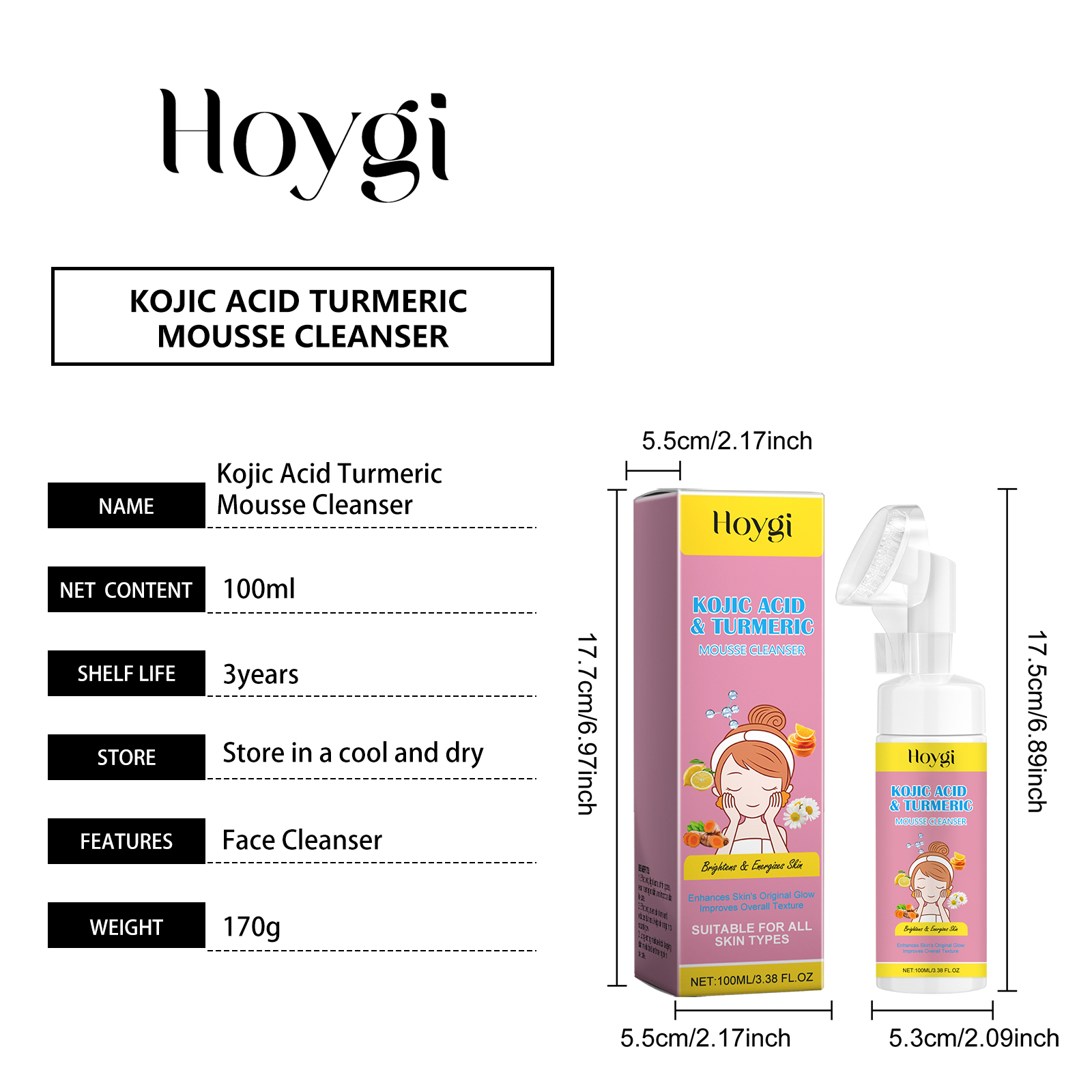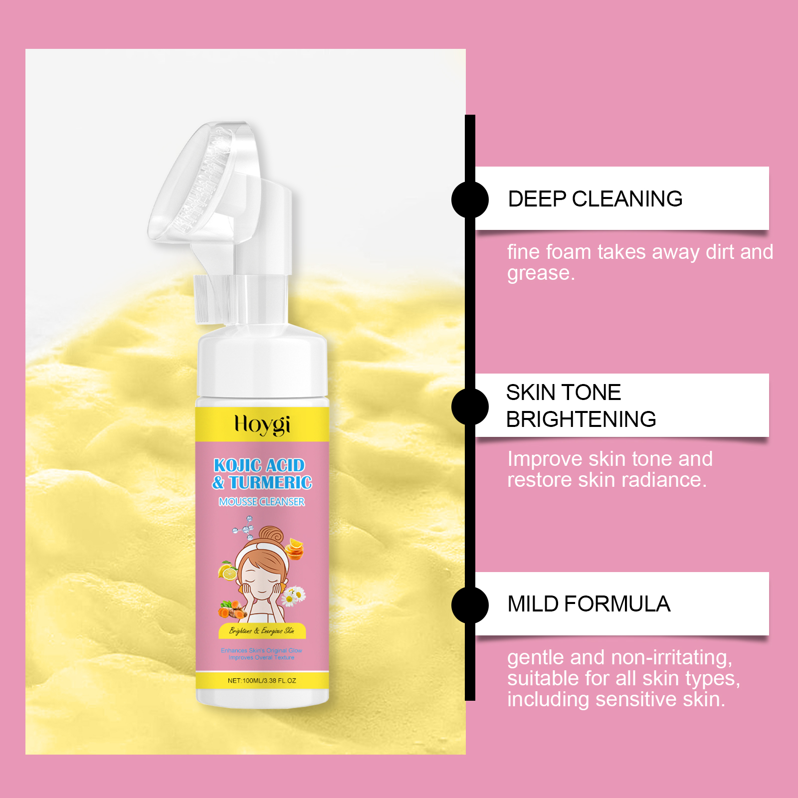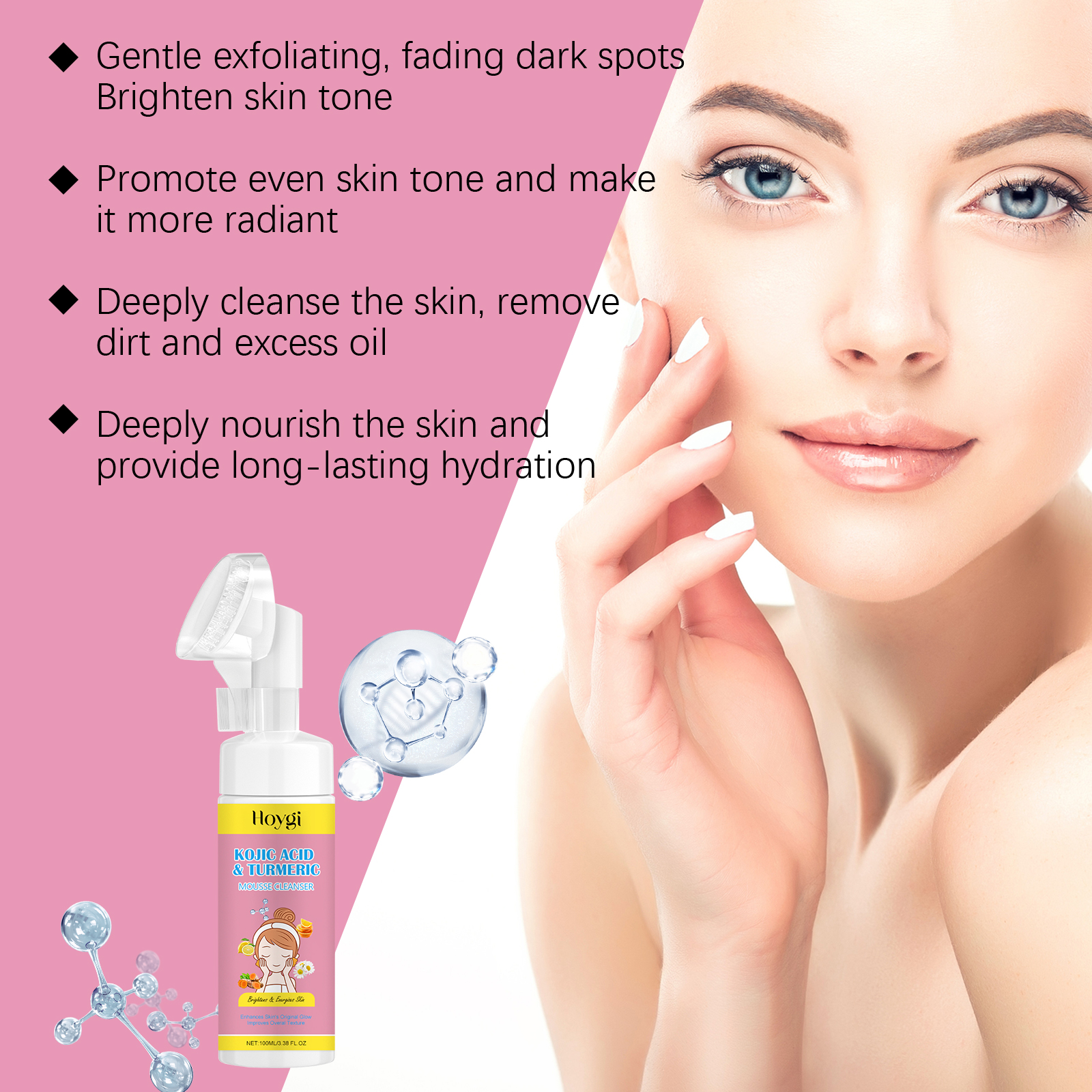 Our turmeric Kojic mousse cleanser contains turmeric extract, kojic acid and chamomile extract. It keeps moisture in the skin and keeps moisture balance. Repair damaged skin and restore skin health. Speed up the removal of dead skin cells and boost metabolism. Glow and enhance skin confidence. Its application method is simple: 1. Clean and moisturize the facial skin; 2. Squeeze out appropriate amount of mousse cleaner and gently massage your face with a brush; 3. Wash your face with clean water until it is clean. Moisturize and retain water, keeping skin hydrated after cleansing.