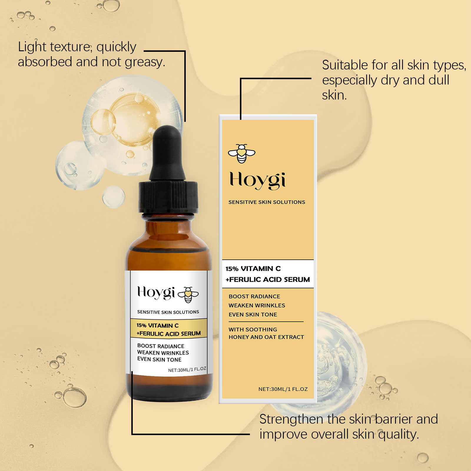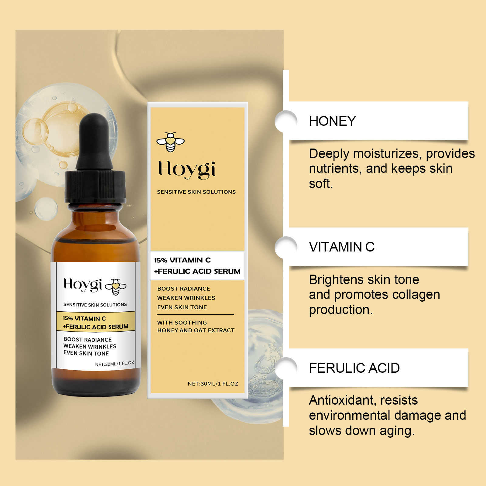 Our Vitamin C Honey serum contains honey, vitamin C, ferulic acid. It deeply moisturizes, provides nutrients, and keeps skin soft. Lighten skin tone and promote collagen production. Anti-oxidation, anti-environmental damage, anti-aging. The way to use it is simple: 1. Clean your skin and keep it dry. 2. Apply proper amount of serum to face evenly. 3. Massage gently to promote absorption. Vitamin C is effective in improving uneven skin and making skin glow. Honey provides rich moisture and keeps the skin moist.