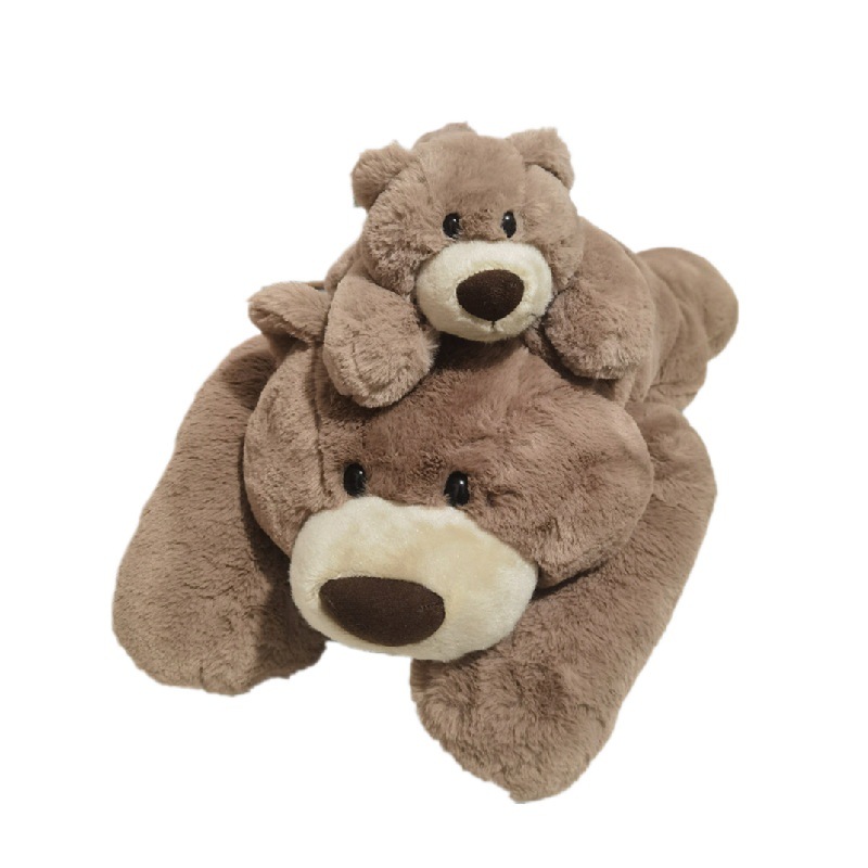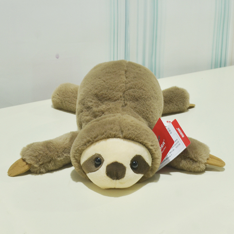 Colors: White lying bear plush, Black lying bear plush, Light brown lying bear plush, Pink lying pig plush, Green lying dinosaur plush, Gray lying husky, Camel lying sloth plush, Silver-gray raccoon plush, Orange lying fox plush, Blue lying crocodile