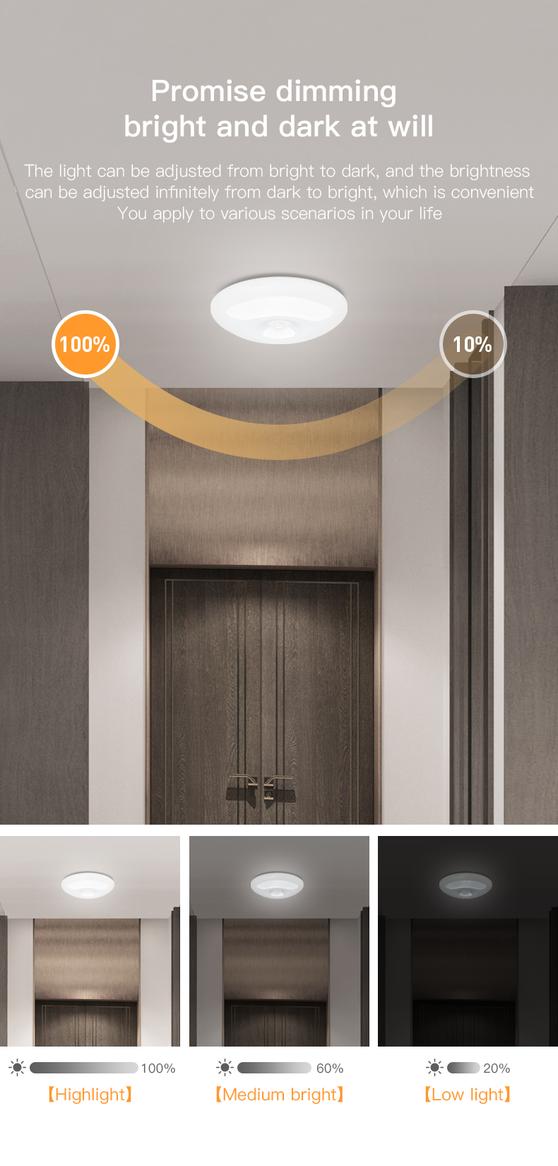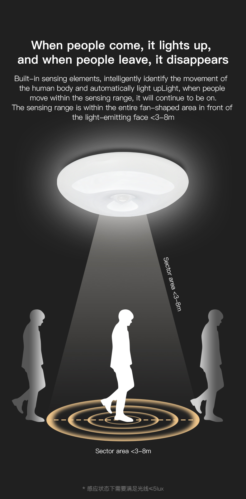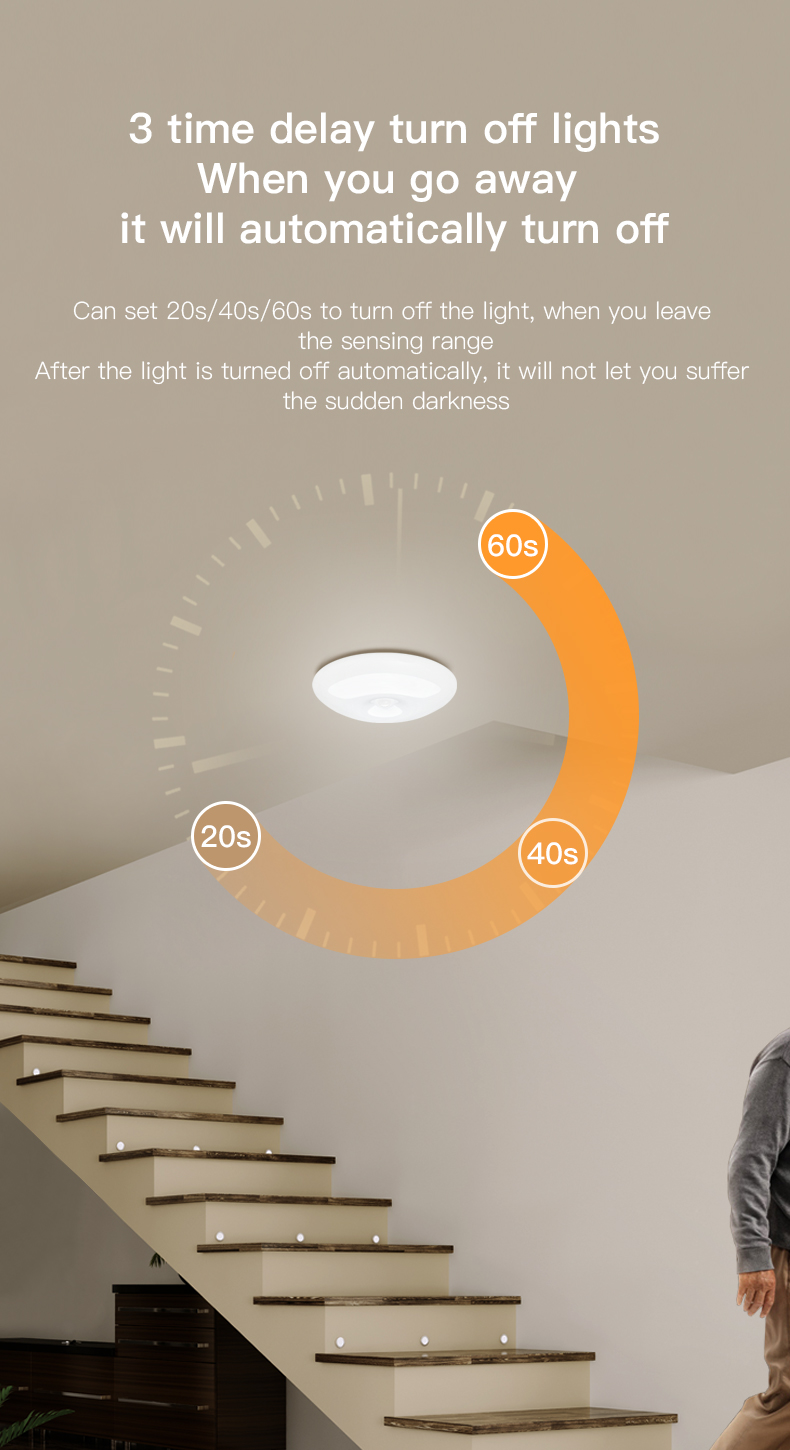 4. The sensing distance is 3-5 meters, the sensing delay time is 20/40/60 seconds, and the sensing angle is 120 degrees