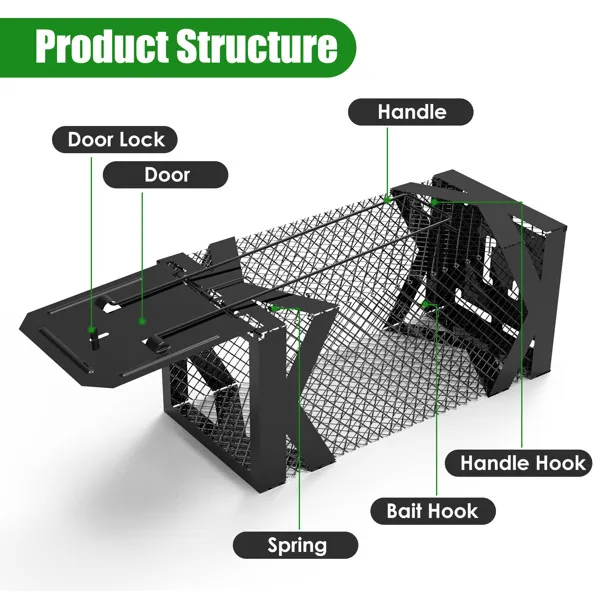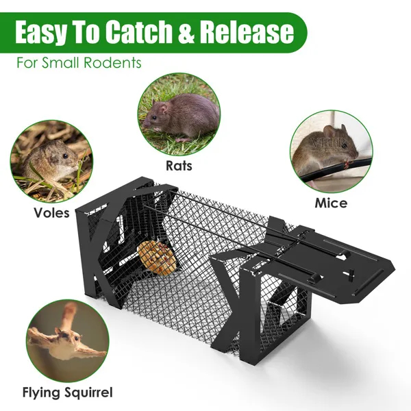 This humane mouse trap cage is an effective solution for catching small rodents like mice, voles, and hamsters, but not larger animals like squirrels. No electricity, harmful chemicals or poisons, making it safe for pets and children. Made with sturdy 1.15mm rust-resistant metal wires and corrosion-proof coating, it's suitable for indoor and outdoor use in homes, gardens, warehouses, and commercial spaces.