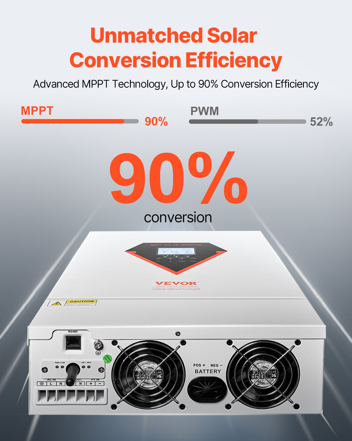 Efficient MPPT Charging Technology: Equipped with an advanced MPPT solar charge controller, this hybrid solar power inverter supports up to 100A battery charging, boosting solar energy conversion efficiency to 90%. It supports a maximum power of 4000W and a voltage range from 60V to 500V DC, making it highly compatible with a wide range of solar systems
