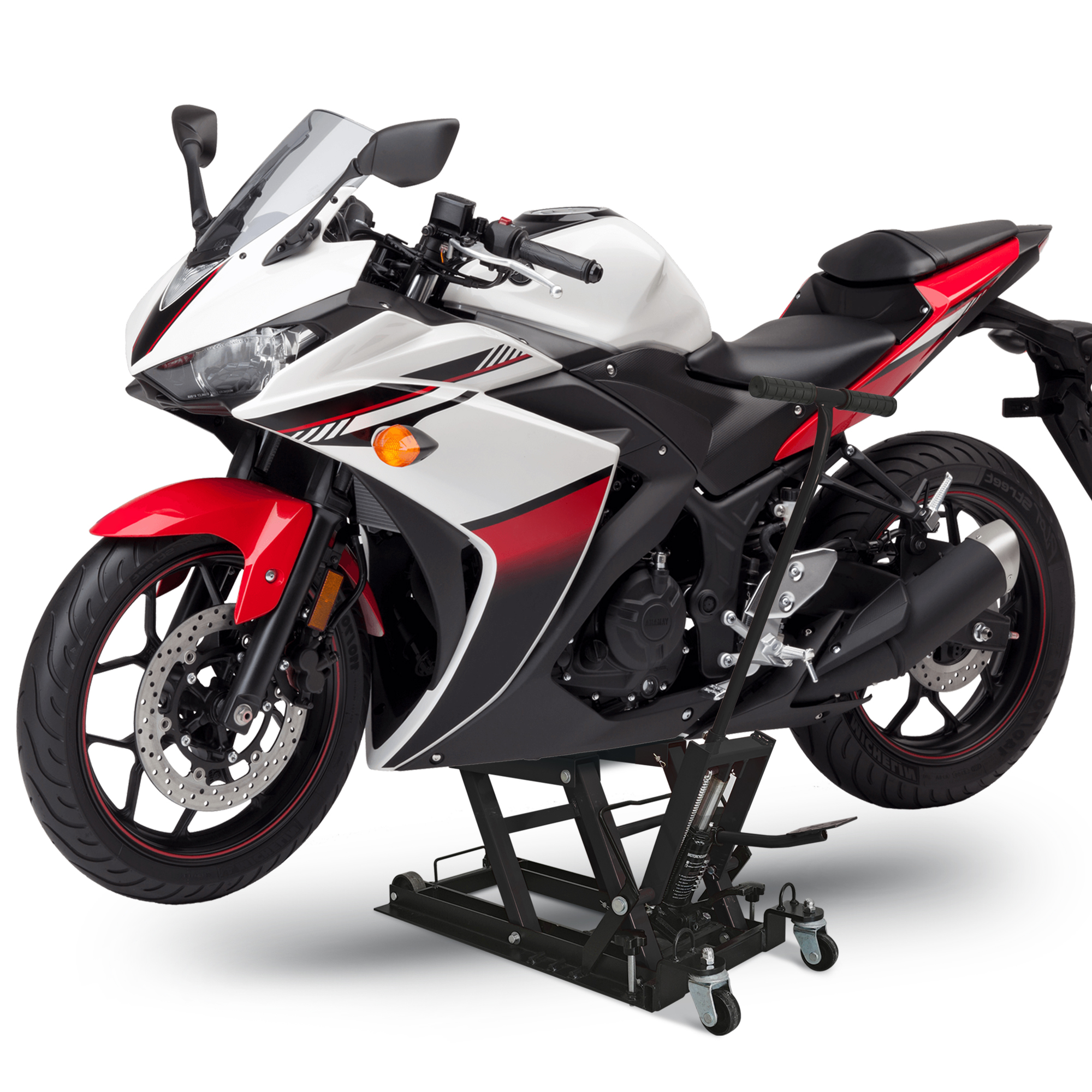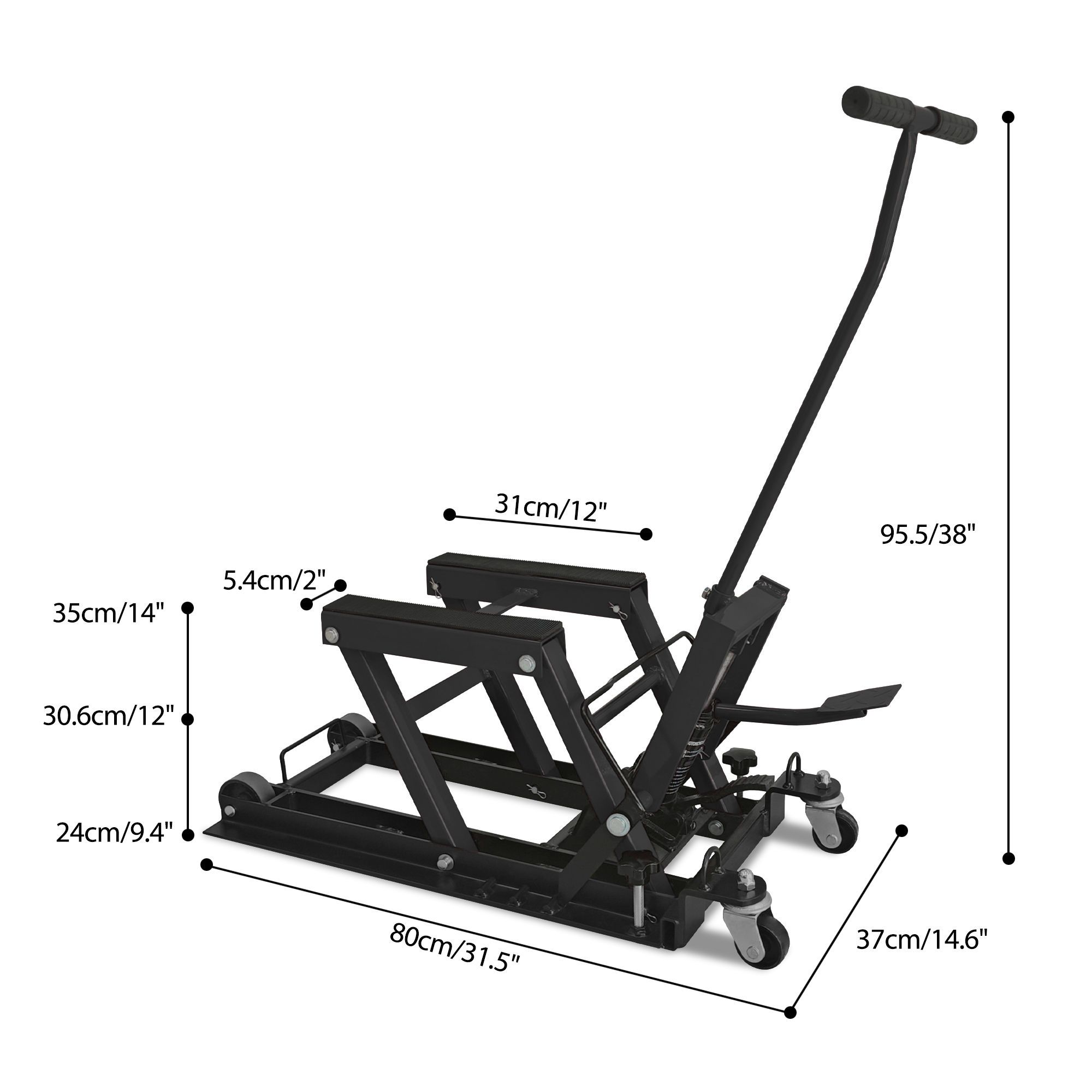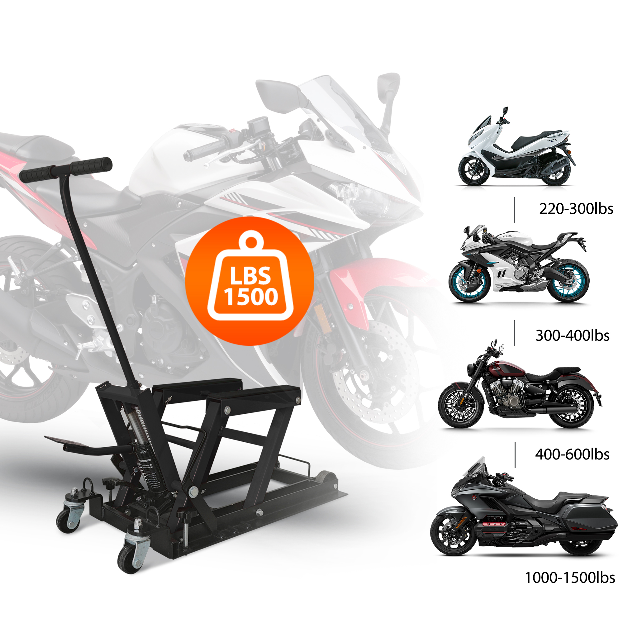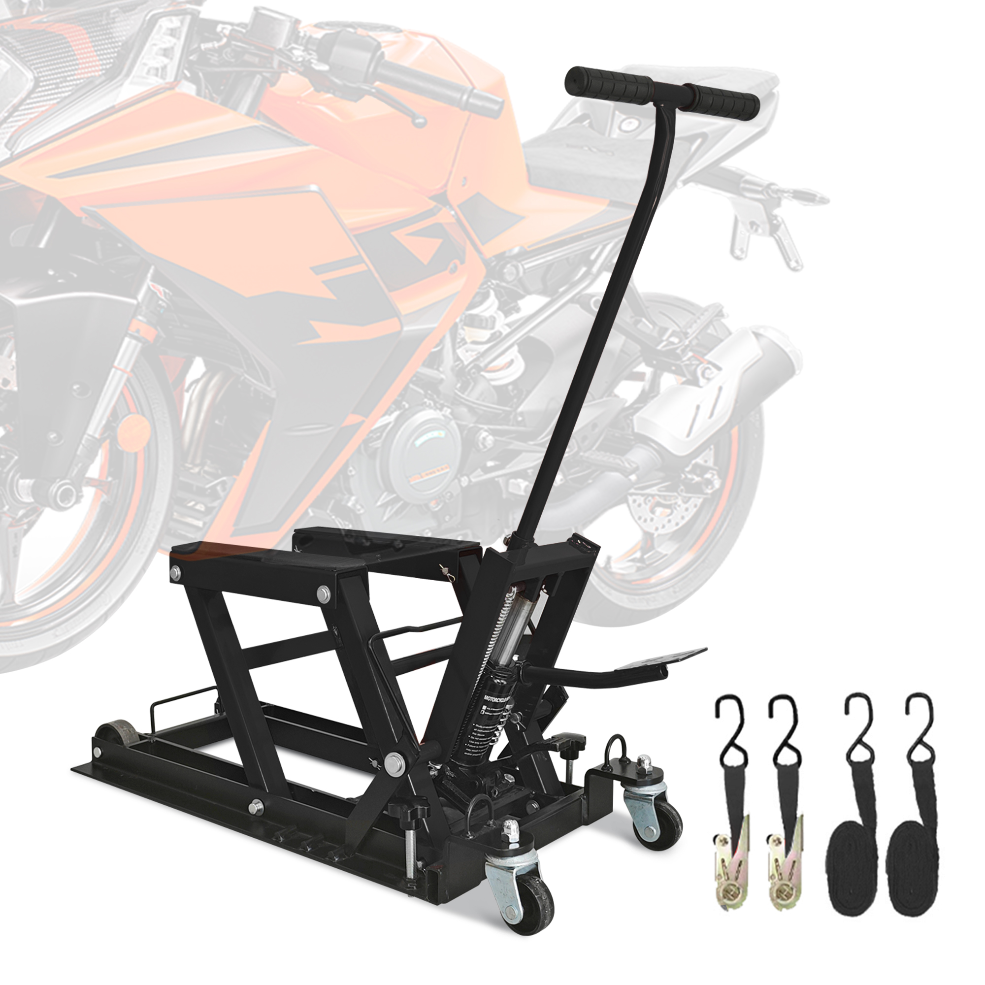 1500 LBS Weight Capacity: When you need to lift your motorcycle for maintenance and cleaning, you can work with our hydraulic motorcycle lift jack. Through the load-bearing tests, the motorcycle lift jack can securely hold up to 1500 lbs/0.7 tons. Perfect for garages, it effortlessly lifts motorcycles, cruisers, touring bikes, ATVs etc, making repairs and maintenance quicker and easier than ever. Adjustable Height (4.7"–15") for Versatile Use: With a long handle and press pedal, this motorcycle lift jack allows easy operation and lifting with minimal effort. The hydraulic pump provides a lifting range of 4.7 to 15 inches, making motorcycle jack stand lift perfect for heavy motorcycles with less resistance. Enhanced Safety for Stable Lifting: Our hydraulic motorcycle jack has a 3-position safety pin that secures it at the required height. The non-slip rubber stripe platform and 2 ratchet belts ensure the stability of heavy vehicles during maintenance, making the motorcycle lift safer for operation. Lockable & Portable Design with Casters: Comes equipped with 2 fixed casters and 2 universal casters, making the motorcycle lift easy to move under the motorcycle or wherever you need it. The motorcycle stand can also help with short-distance transport of heavy dirtbikes and ATVs. Durable Steel Construction: Made of high-strength solid steel structure and coated with a black powder coating, this motorcycle jack is rust, corrosion, and grease-resistant, ensuring a long-term use and storage. Neatly store it in your garage or repair shop for easy access.