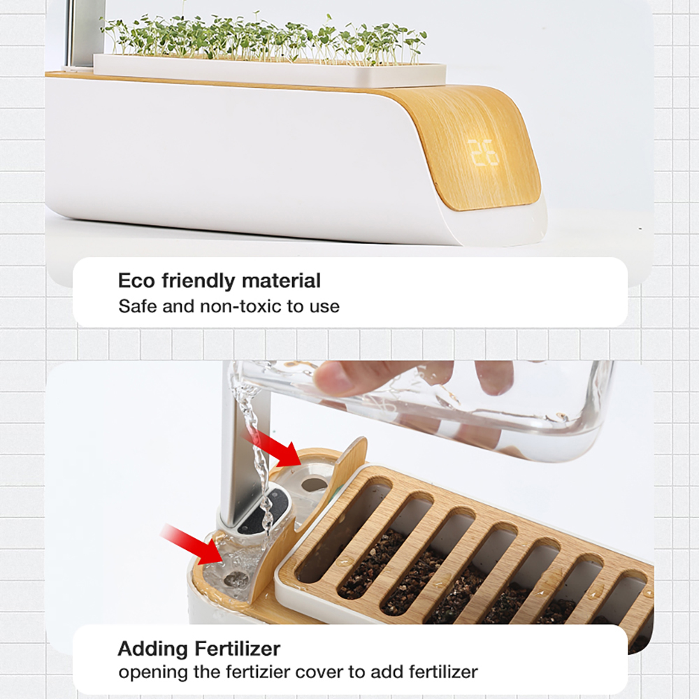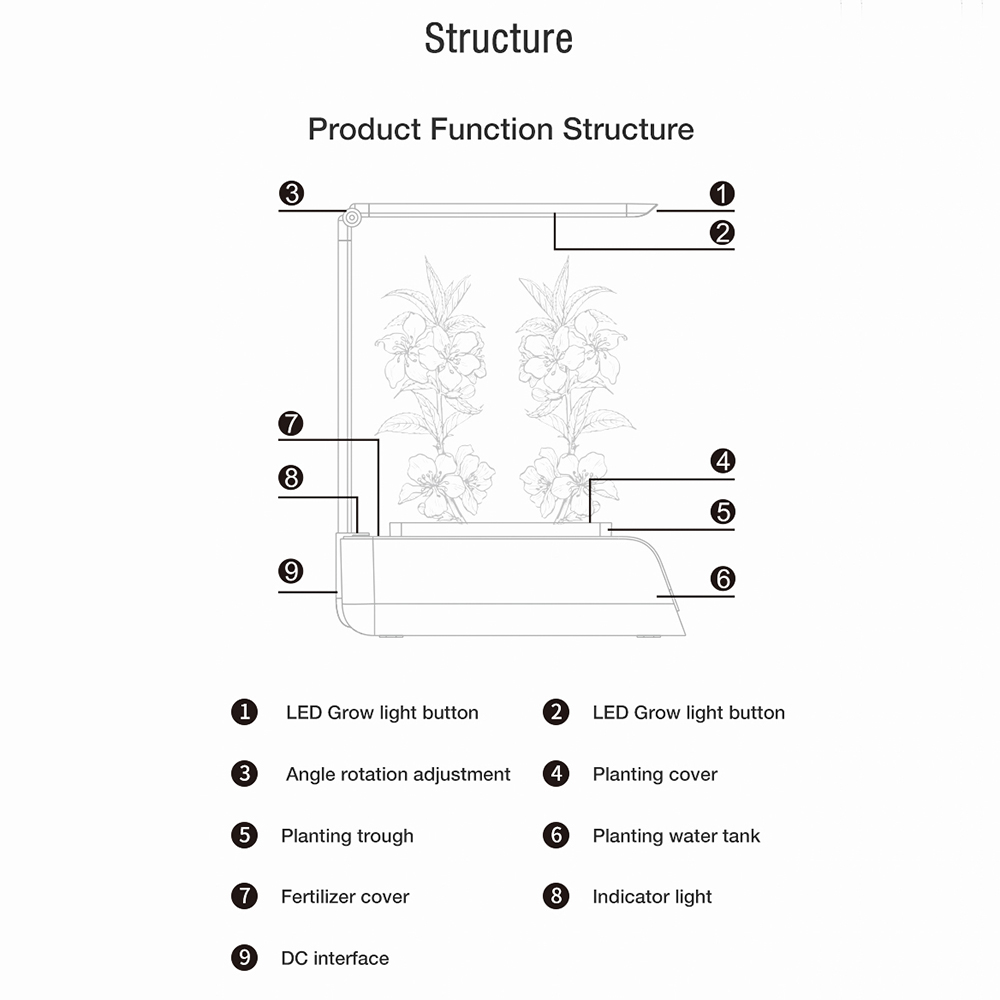 Pot assembly shell * 1, lamp pole * 1, typ-c charging line * 1, adapter * 1, English manual * 1, certificate * 1, nutrient soil * 1