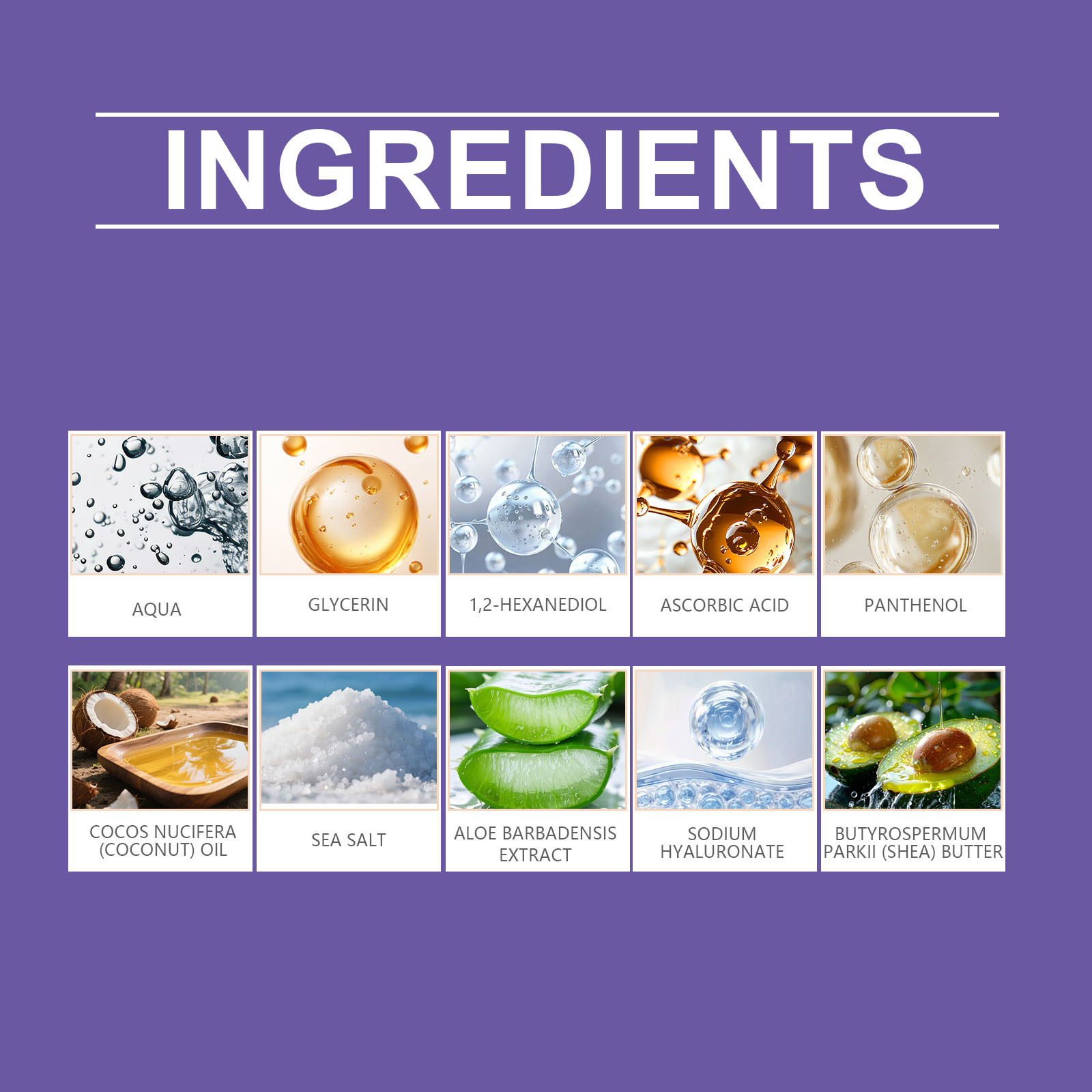 Ingredients: water glycerin, 1,2- hexanediol, ascorbic acid (vitamin C), panthenol coconut oil, sea salt, Aloe Vera extract, sodium hyaluronate, butter and fruit fat.