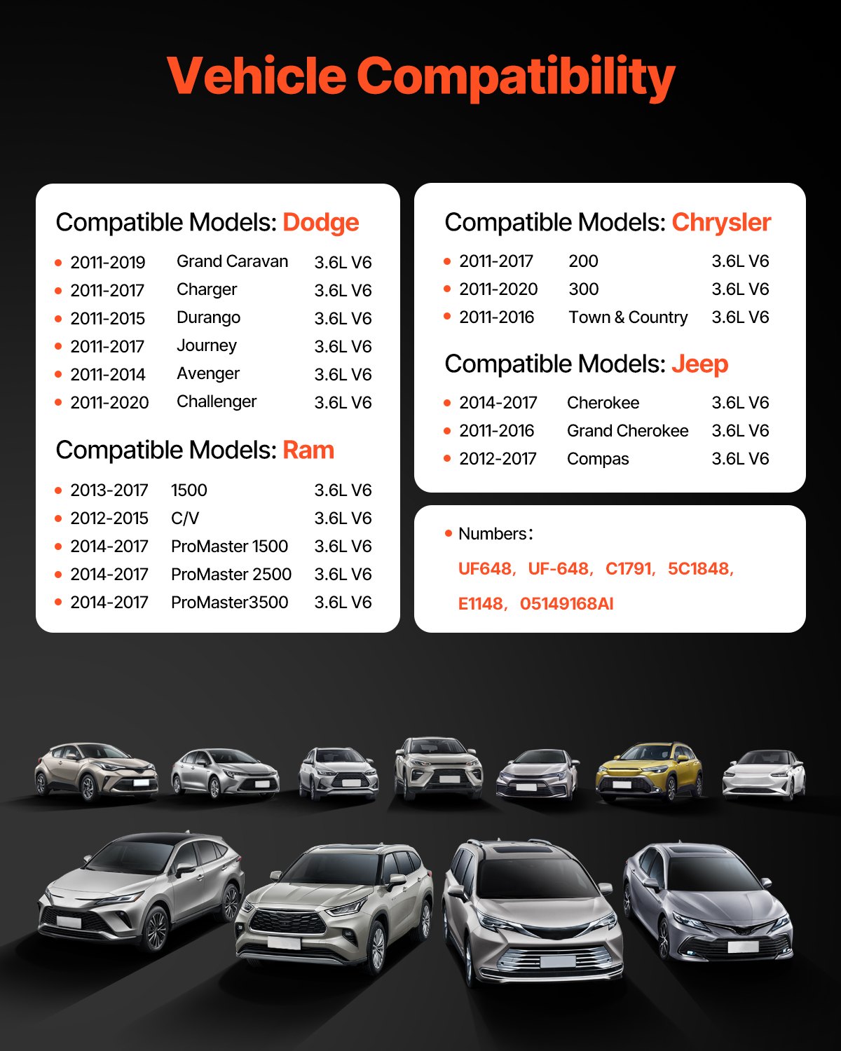 Precise Compatibility: OE standard codes (UF648, UF-648, C1791, 5C1848, E1148, 05149168AI) ensure the ignition coil pack and spark plugs match your vehicle precisely