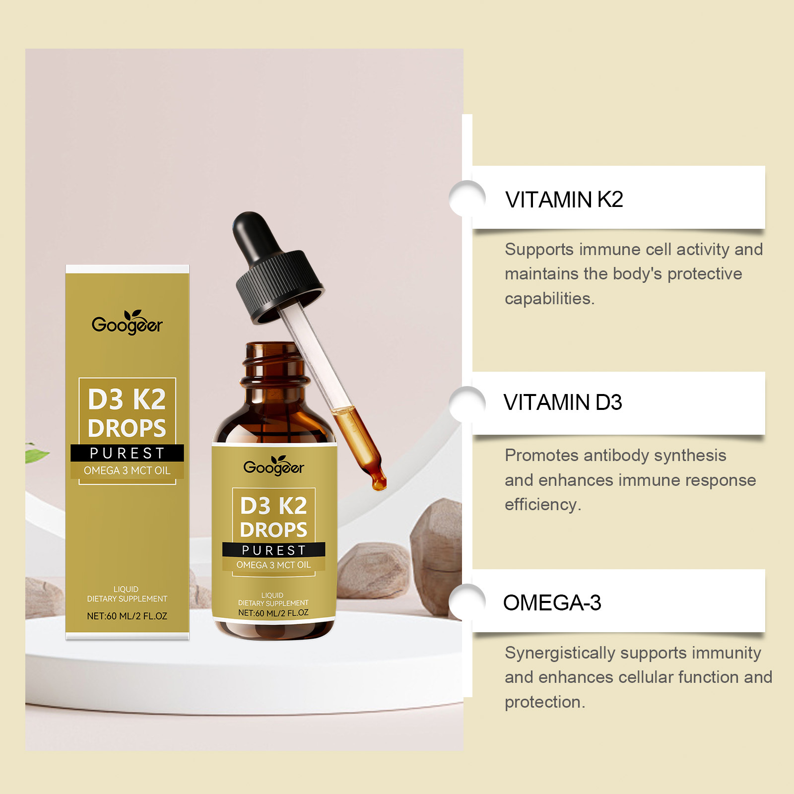 Ingredients: vitamin K2 (menadione -7), vitamin D3 (cholecalciferol), omega-3 (from Spanish sage chia seed oil), medium-chain triglyceride oil (from coconut oil).