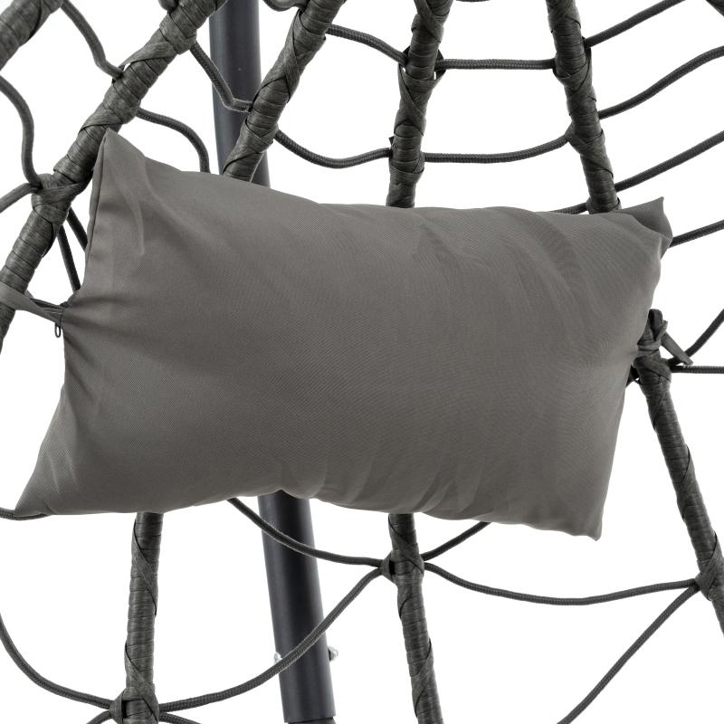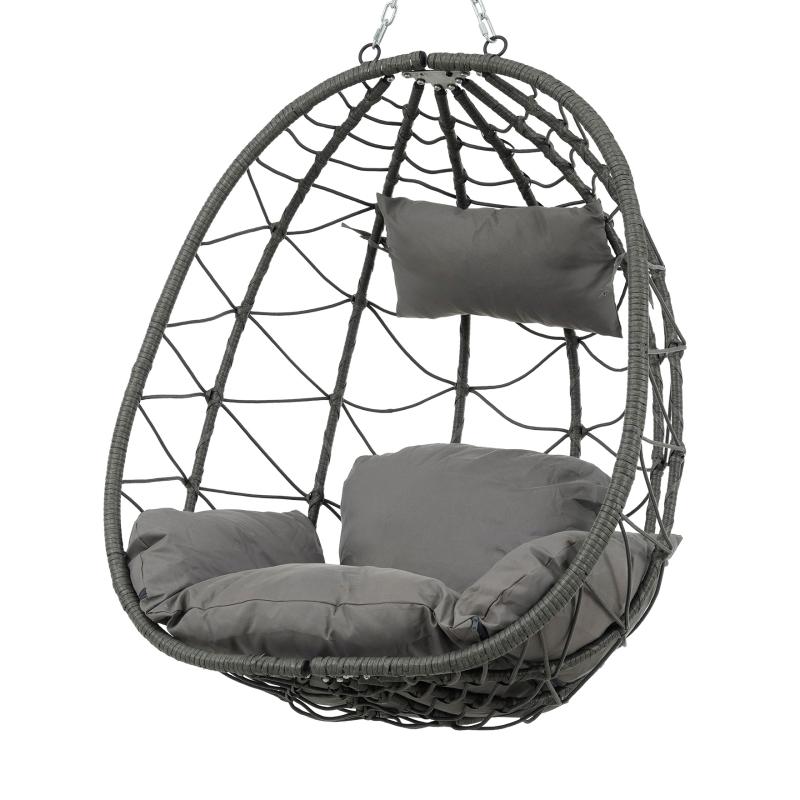 The frame is made of metal tube, with PE wicker rattan, Polyeter Fibre Hand woven. the cushion stuffing is polyester fiber, it can support long time crash. Specifications: Color: Dark Grey Material: PE Wicher, Metal Tube, Plastic End Cap. Product Dimensions: W38.6*D36.2*H76.8 INCHES Weight :47.4 lb Package Included: 1 x Hanging Egg Chair