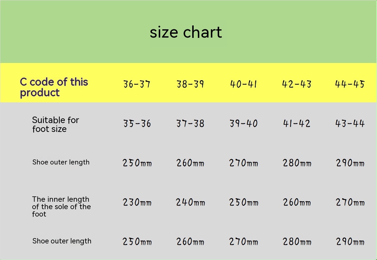 Size: 36-37 (suitable for 35-36 feet),38-39 (suitable for 37-38 feet),40-41 (suitable for 39-40 feet),42-43 (suitable for 41-42 feet),44-45 (suitable for foot size 43-44)