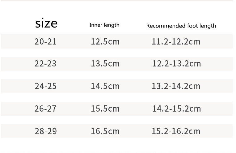 Children's socks sizes: 20-21 (inner sole length of 12.5), 22-23 (inner sole length of 13.5), 24-25 (inner sole length of 14.5), 26-27 (inner sole length of 15.5), 28-29 (inner sole length) Length 16.5)