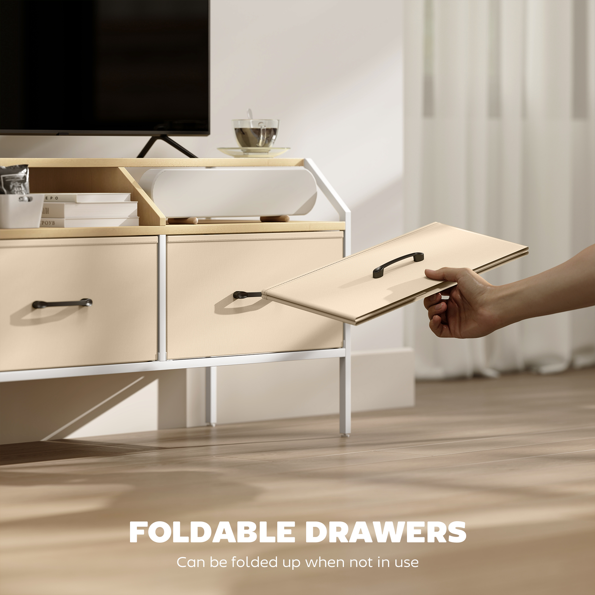 Style and storage all in one, with this TV stand cabinet. It comes with two large drawers, two shelves, side pockets and a flat tabletop - plenty of room for media devices, media and other TV essentials; the table has room for a screen up to 55". And thanks to the industrial-style design, you'll be bring a touch of striking style into your space.