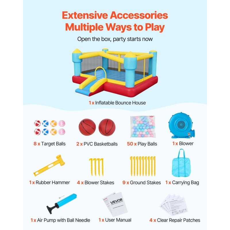 Built for Play: Designed with a large bounce area and slide, our bounce castle offers diverse activities for kids and families to enjoy together. A complimentary target adds an interactive throwing game for group play. The package includes 8 target balls, 2 PVC basketballs, and 50 play balls