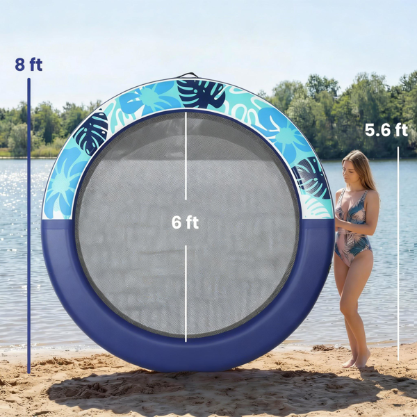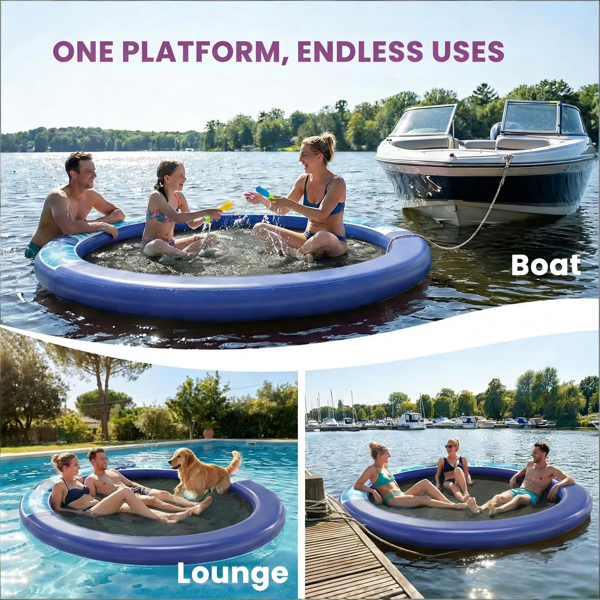 Features: - Central mesh design keeps your body cool in the water while your head stays dry for safer, more interactive play - Built with thick brushed plastic and reinforced polyester to resist punctures, UV damage, and long-term wear - Inflates up to 8 PSI for hard-board stability - 5.9" thick construction and a wide 95.7" diameter deliver exceptional balance on open water - 4 D-rings allow easy anchoring, towing, or connecting to boats and docks - Functions as a swim platform, sun pad, yoga mat, social lounge, or pet-friendly resting dock - Includes pressure-gauge pump, carry bag, and repair kit for fast setup, easy transport, and simple maintenance Specification: color: Blue - Material: Brushed Plastic, Polyester - Overall Dimension: 95.7" L x 95.7" W x 5.9" H - Folding Size: 42.5" L x 15.7" W x 7.9" H - Inner Size: 72" Dia. - Maximum Load: 484 lbs.