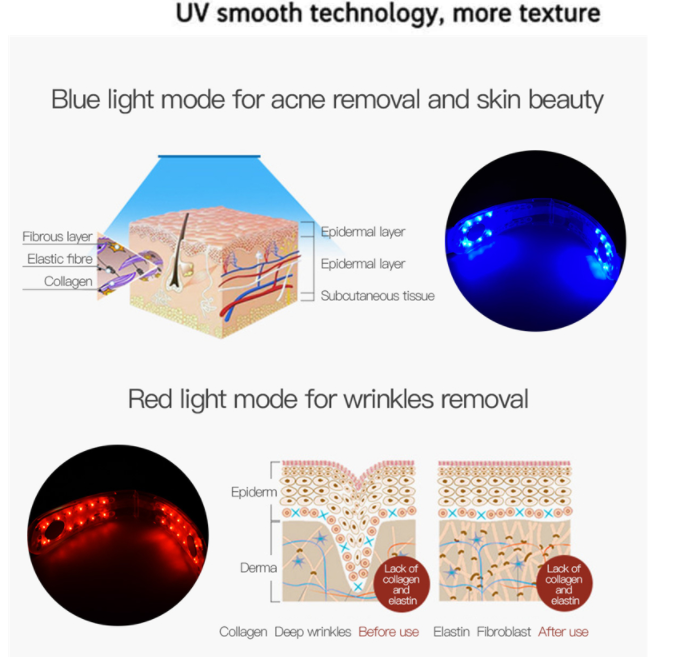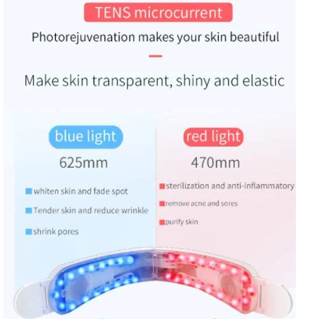 1.Infrared Hot Compress Therapy Expand pores through hot compress, remove toxins to promote skin absorption of nutrition, stimulate collagen secretion, activate collagen fibers, and reduce facial wrinkles. 2. Blue light mode for acne removal, Red light mode for flat wrinkle skin. 2 lights work together for comprehensive skin care. 3.Strong V-Face Shaping Result Can effectively fix the face contours, make the face smaller and smoother. 4.TENS physiotherapy and micro current are adopted to enhance cell activity, promote muscle movement, accelerate blood circulation, enhance fat metabolism, which can pull the face for a slimmer, smoother and firmer face line.