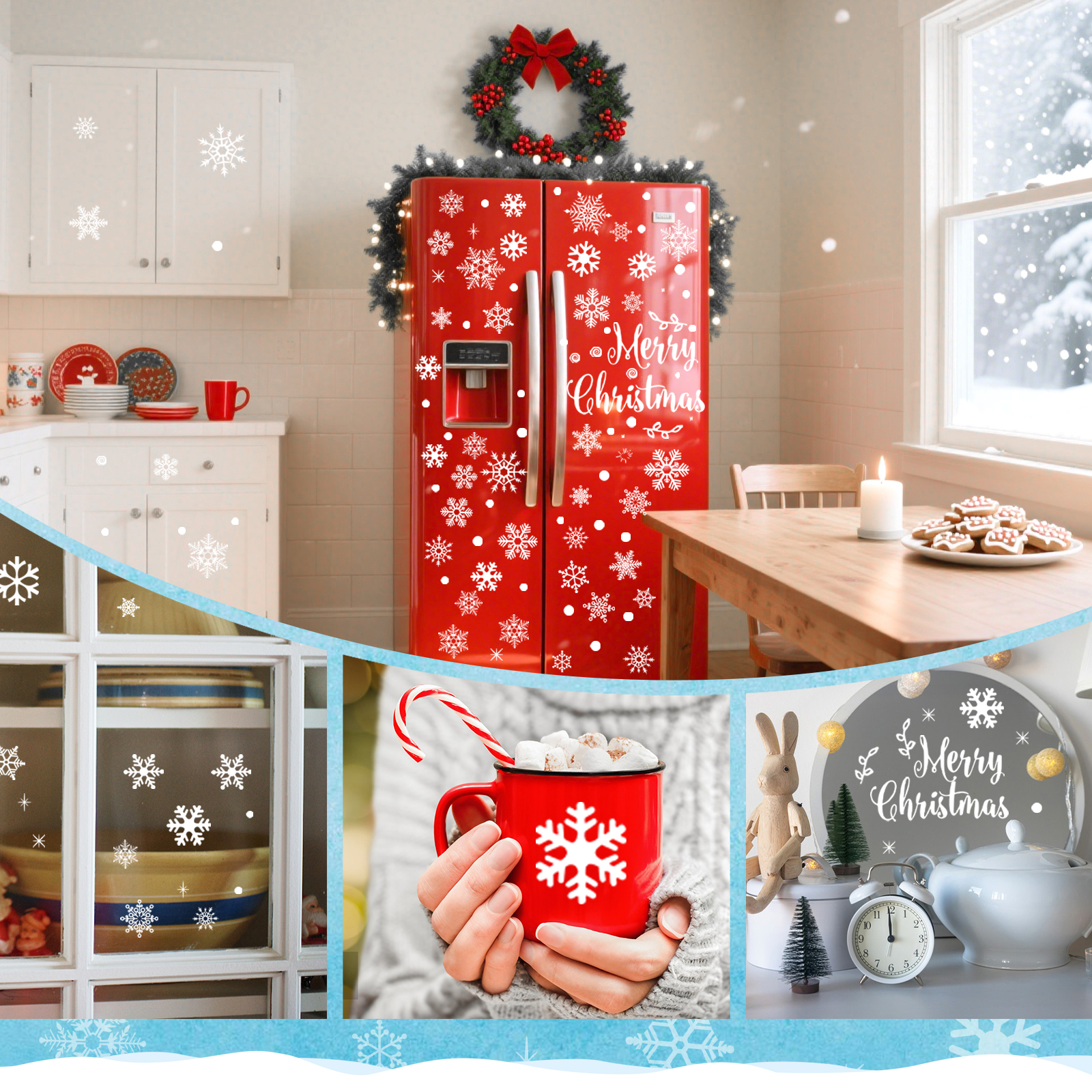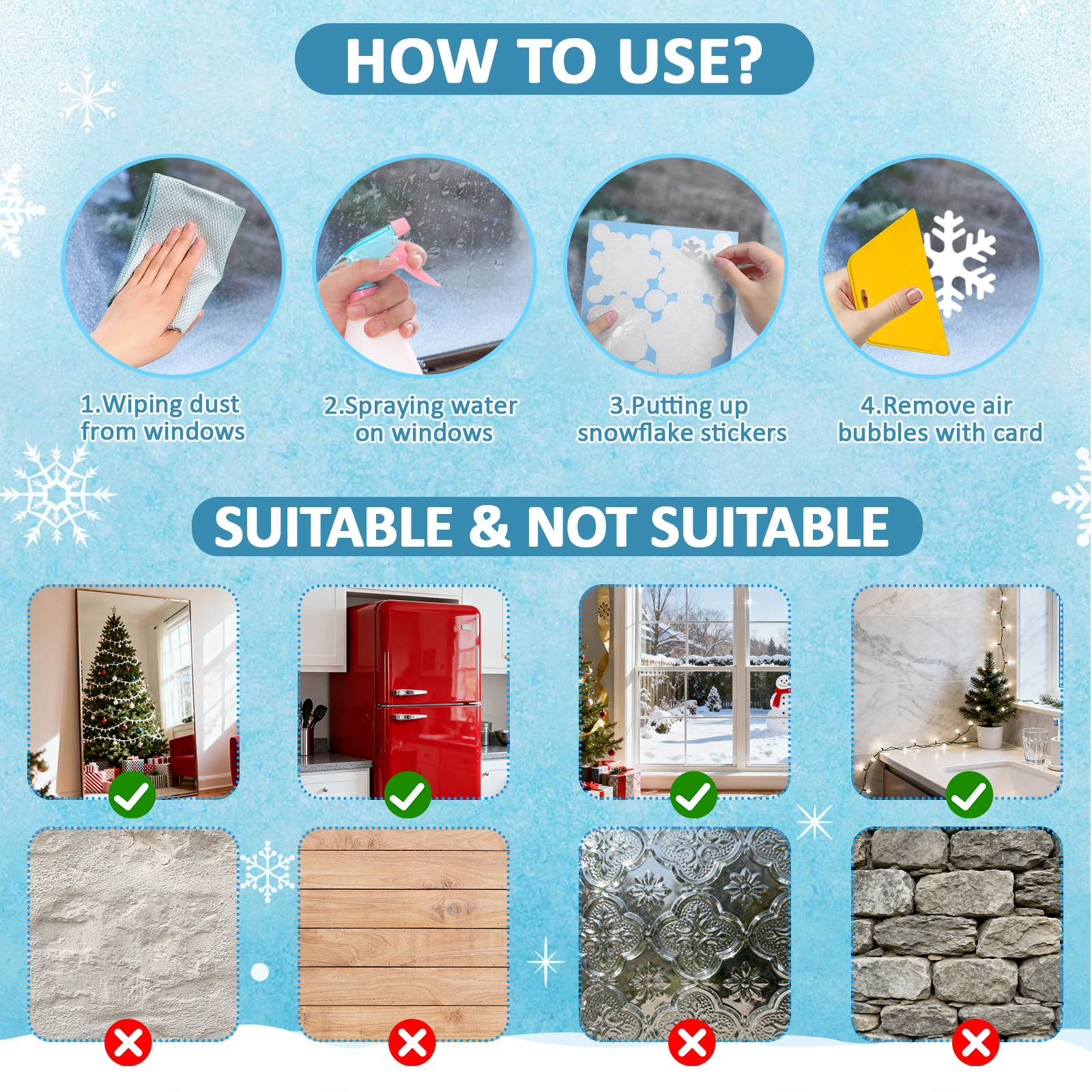 WIDELY APPLICABLE CHRISTMAS DECORATIONS: These xmas window stickers are not only for window décor , but for glass doors, storefronts, even fridges and similar other places, or wherever you want to create the classic Christmas vibe. Transform any pristine, smooth surface into a holiday canvas! With our Christmas window stickers, you can deliver eye-catching holiday styling without the hassle of traditional décor!