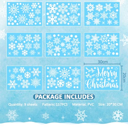CHRISTMAS WINDOW STICKERS SET: This package includes 9 sheets of Christmas window stickers, each measuring 20x30 cm (7.87x11.8 inches), featuring 157 Christmas window stickers with classic simple Christmas patterns, such as snowflakes and Merry Christmas. Decorate your window with these stickers that never go out of style, you can say goodbye to your boring empty windows and hello to timeless Christmas holiday spirit!