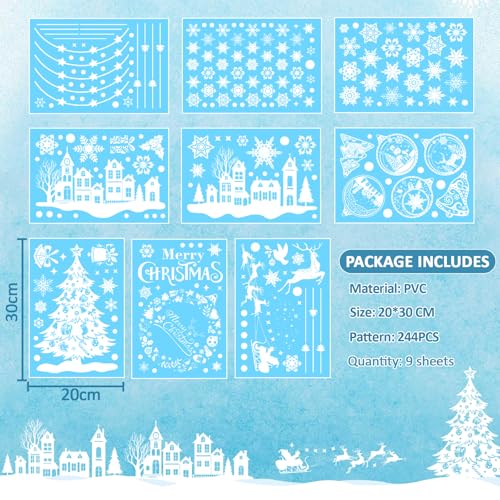 CHRISTMAS WINDOW STICKERS SET: This package includes 9 sheets of Christmas window stickers, each measuring 20x30 cm (7.87x11.8 inches), featuring 244 Stickers with different unique patterns, which contain Christmas symbols such as Santa sleigh, reindeer, crystal ball, Christmas trees, snowflakes, and more. With these versatile stickers, you can say goodbye to your boring windows and hello to jubilant holiday spirit!
