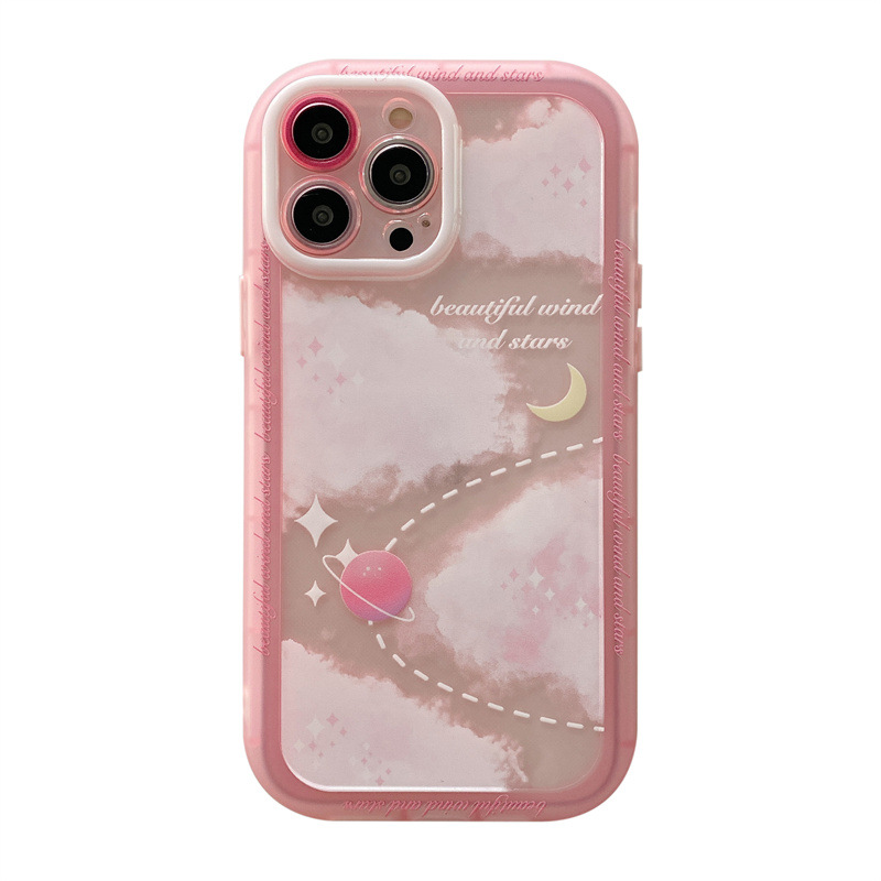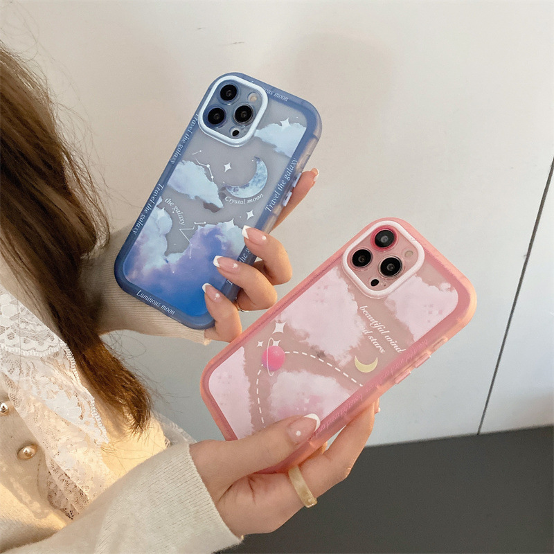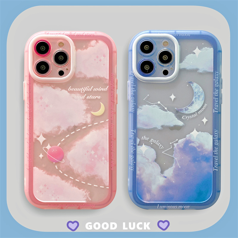 Color: pink edge cloud moon planet, blue purple edge cloud moon starry sky