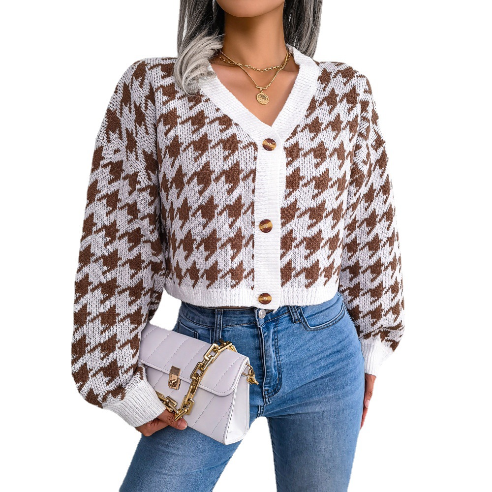 Ins Casual Lantern Long Sleeve Thousand Bird Check Cardigan Sweater