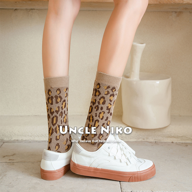 Colors: Leopard print mid-calf socks [Khaki], Leopard print mid-calf socks [Dark Green], Leopard print mid-calf socks [Rust Red], Leopard print mid-calf socks [Goose Yellow], Leopard print mid-calf socks [Black]