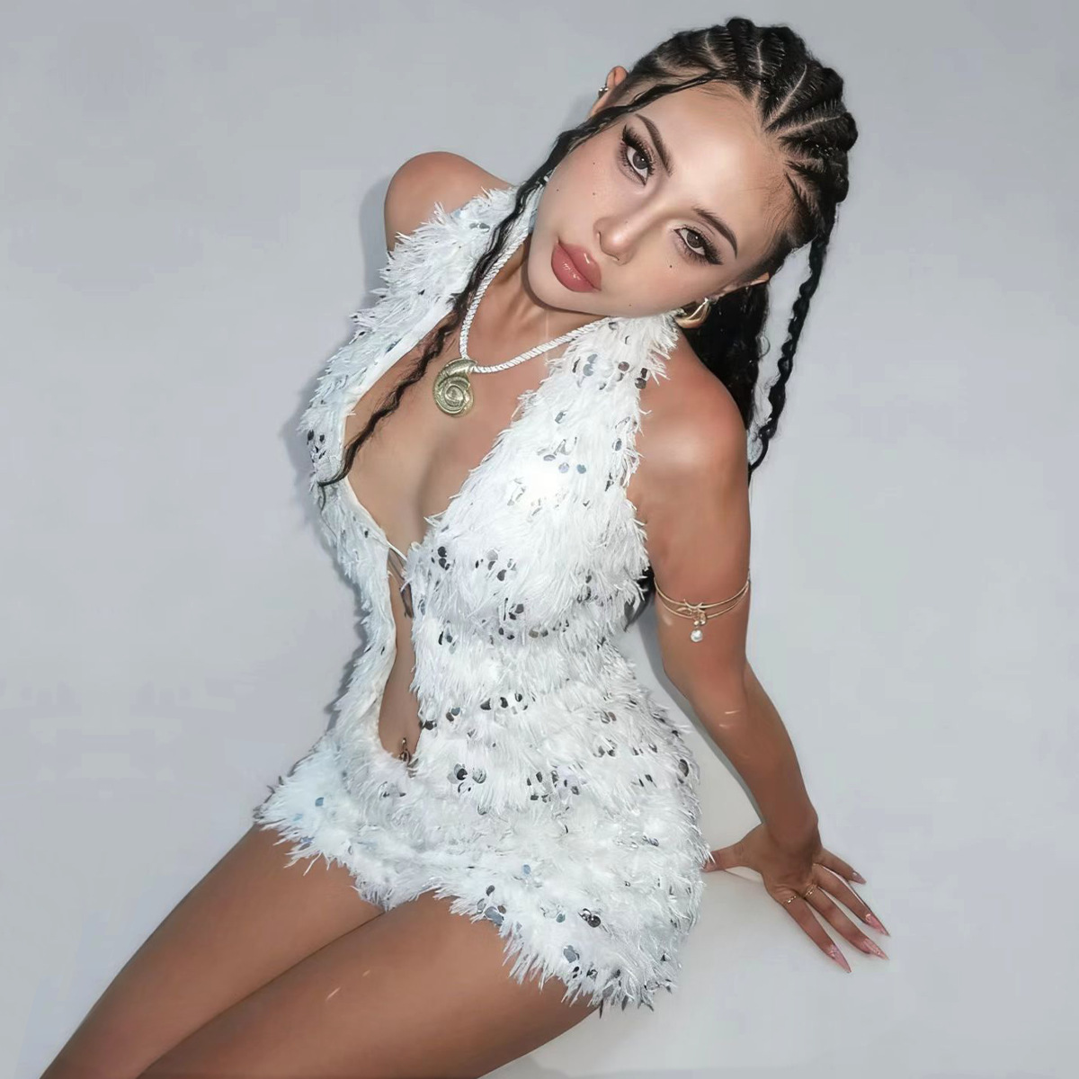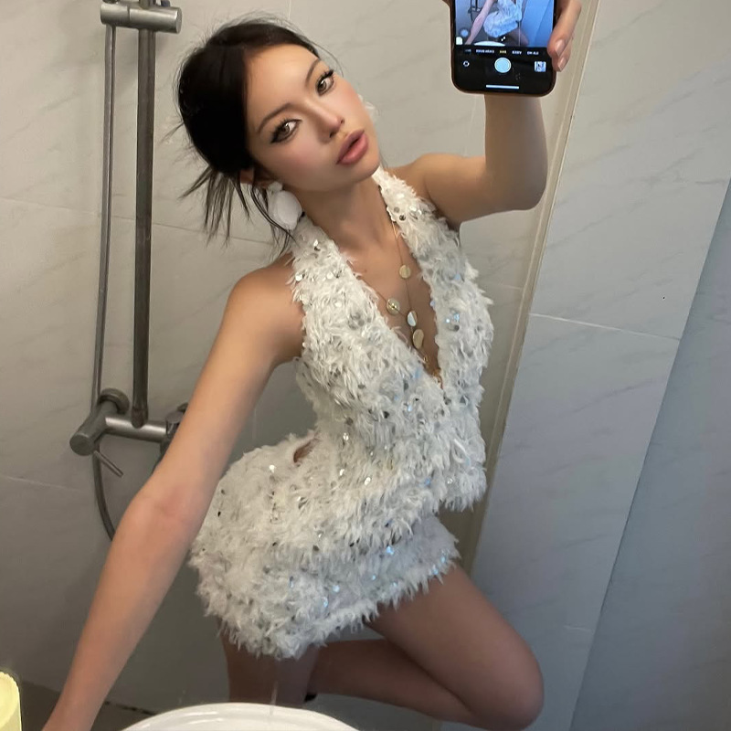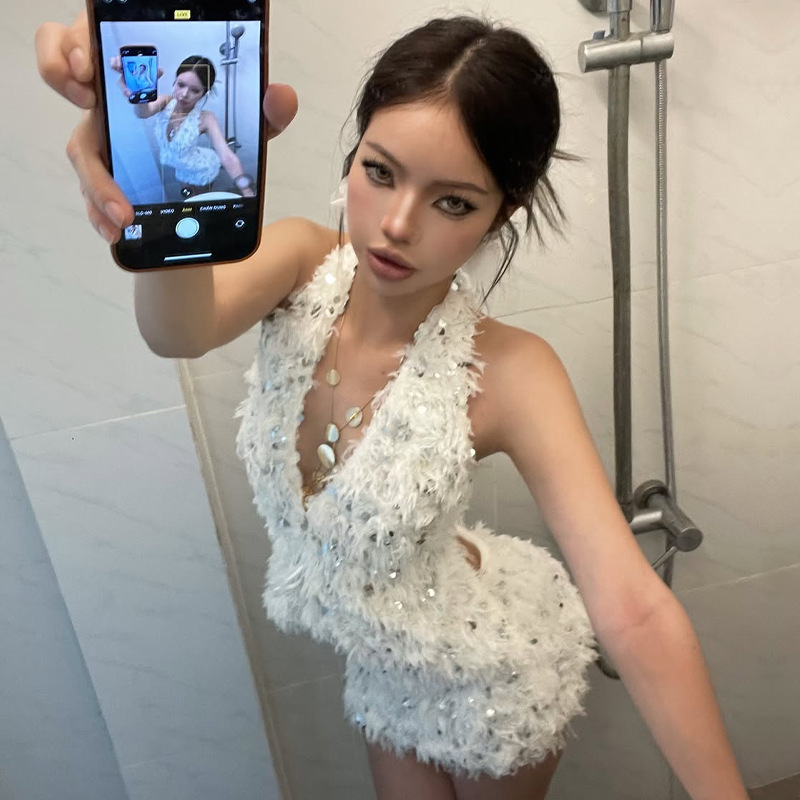 INS Slim-Fit Versatile Deep V-Neck Halter Backless Velvet Sequin Party Bodycon Dress
