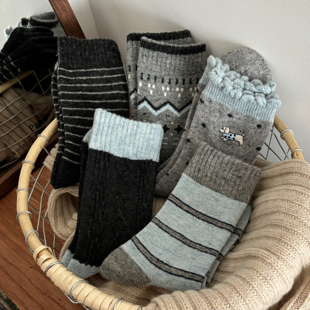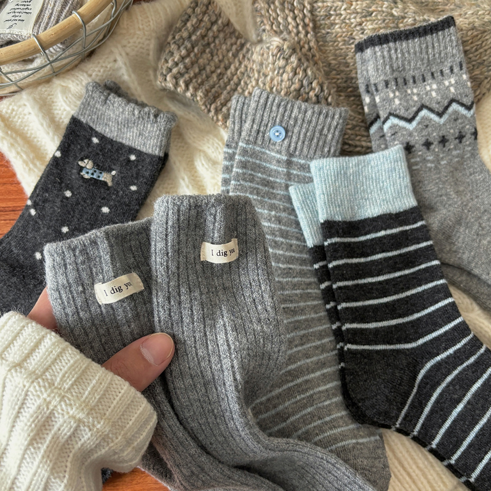 Color: Fabric label, Fair Isle gray, black and gray stripes, buttons, embroidered puppy, dark gray diamond pattern, light gray stripes