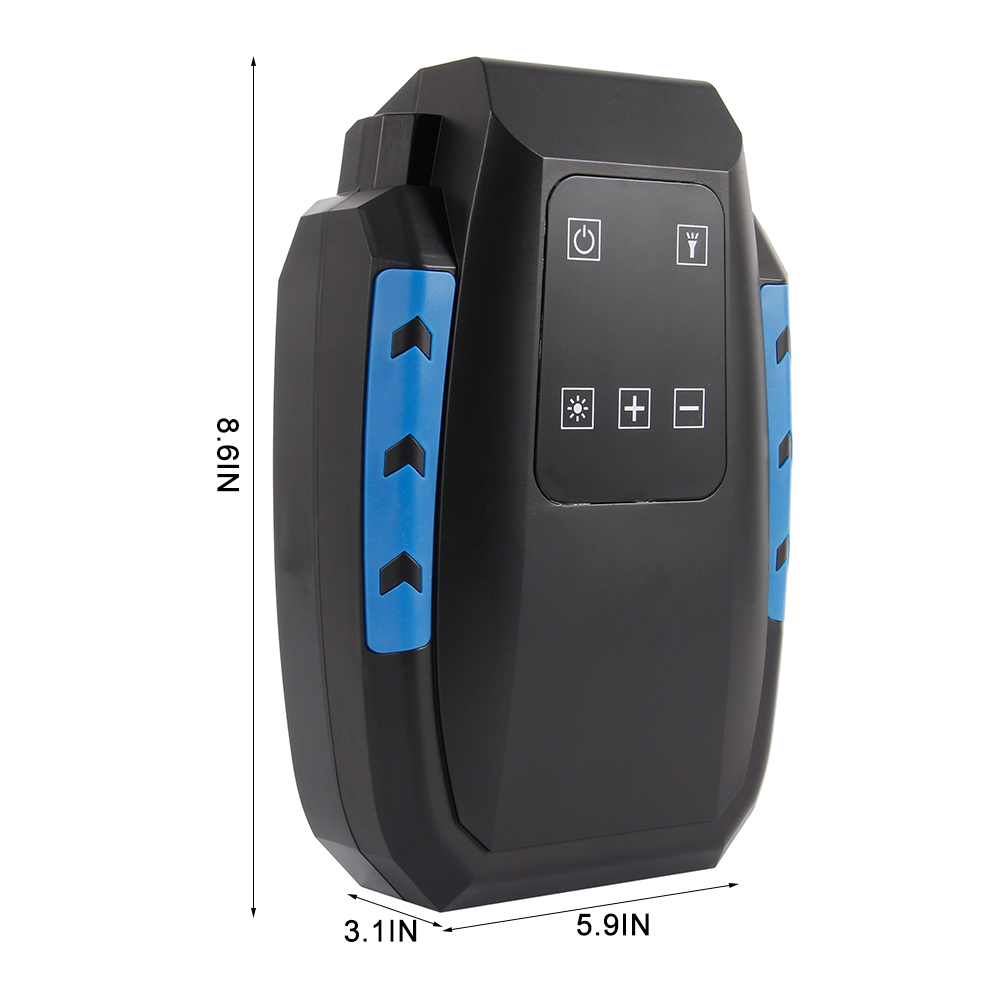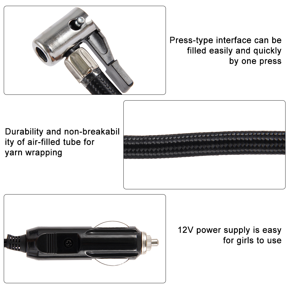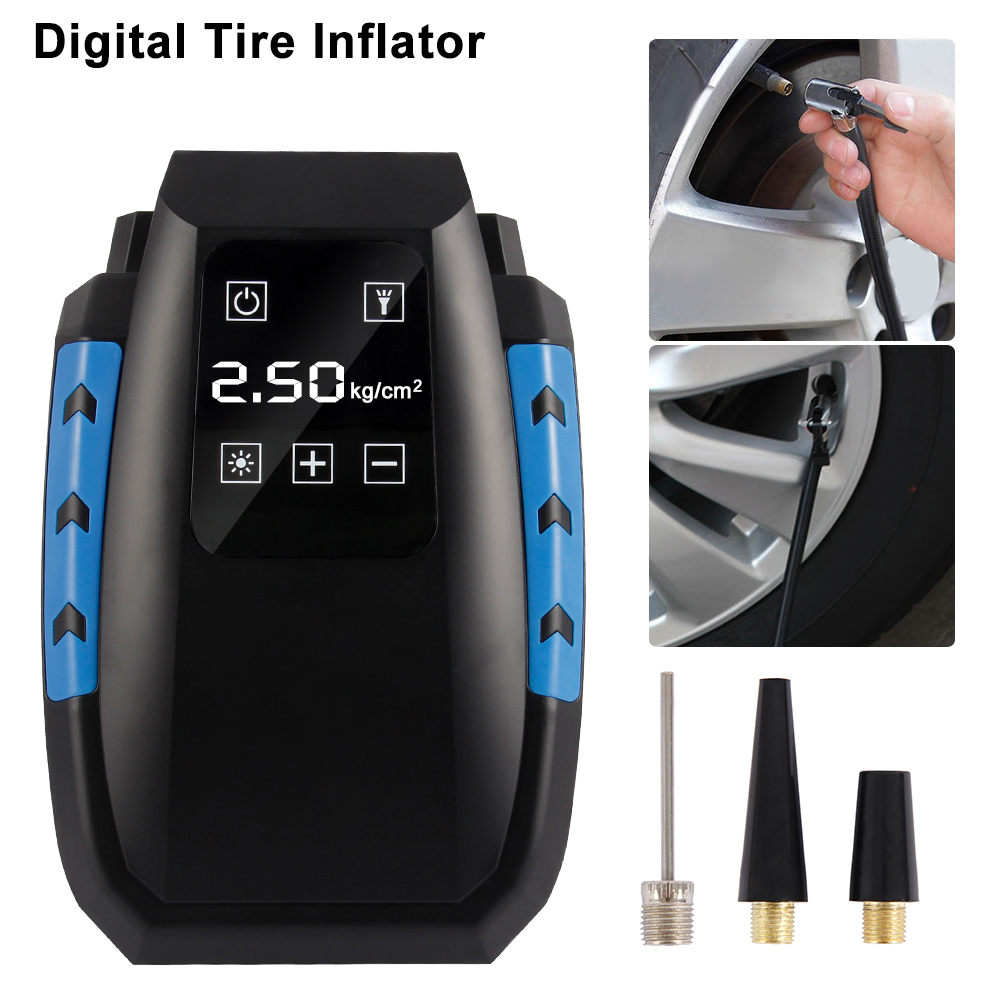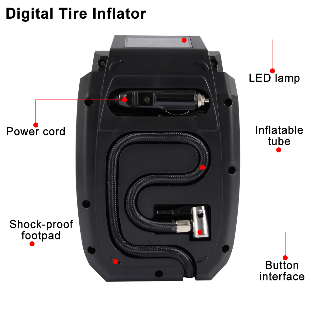 Fast inflation, precise digital display, fully self-stop, preset tire pressure, smart touch, tire pressure memory, LED emergency light, integrated storage