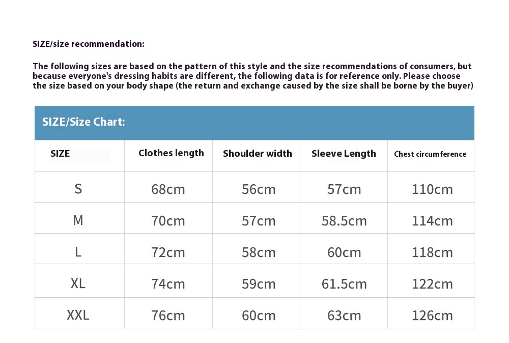 1. Asian sizes are 1 to 2 sizes smaller than European and American people. Choose the larger size if your size between two sizes. Please allow 2-3cm differences due to manual measurement. 2. Please check the size chart carefully before you buy the item, if you don't know how to choose size, please contact our customer service. 3.As you know, the different computers display colors differently, the color of the actual item may vary slightly from the following images.