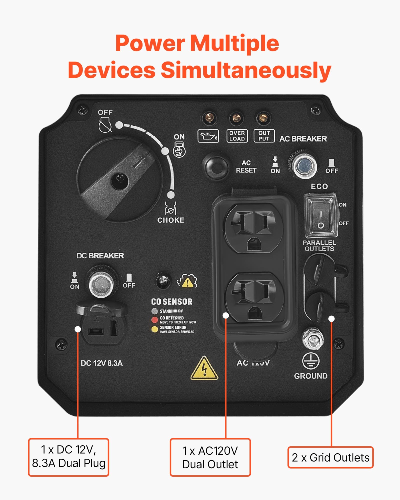 Multiple Power Outlets: Our generator inverter features multiple outlets: one AC120V American dual outlet, one DC 12V & 8.3A dual plug, and two grid outlets. Rated at AC120V, it allows several devices to operate simultaneously, providing convenient and versatile power for outdoor or home use