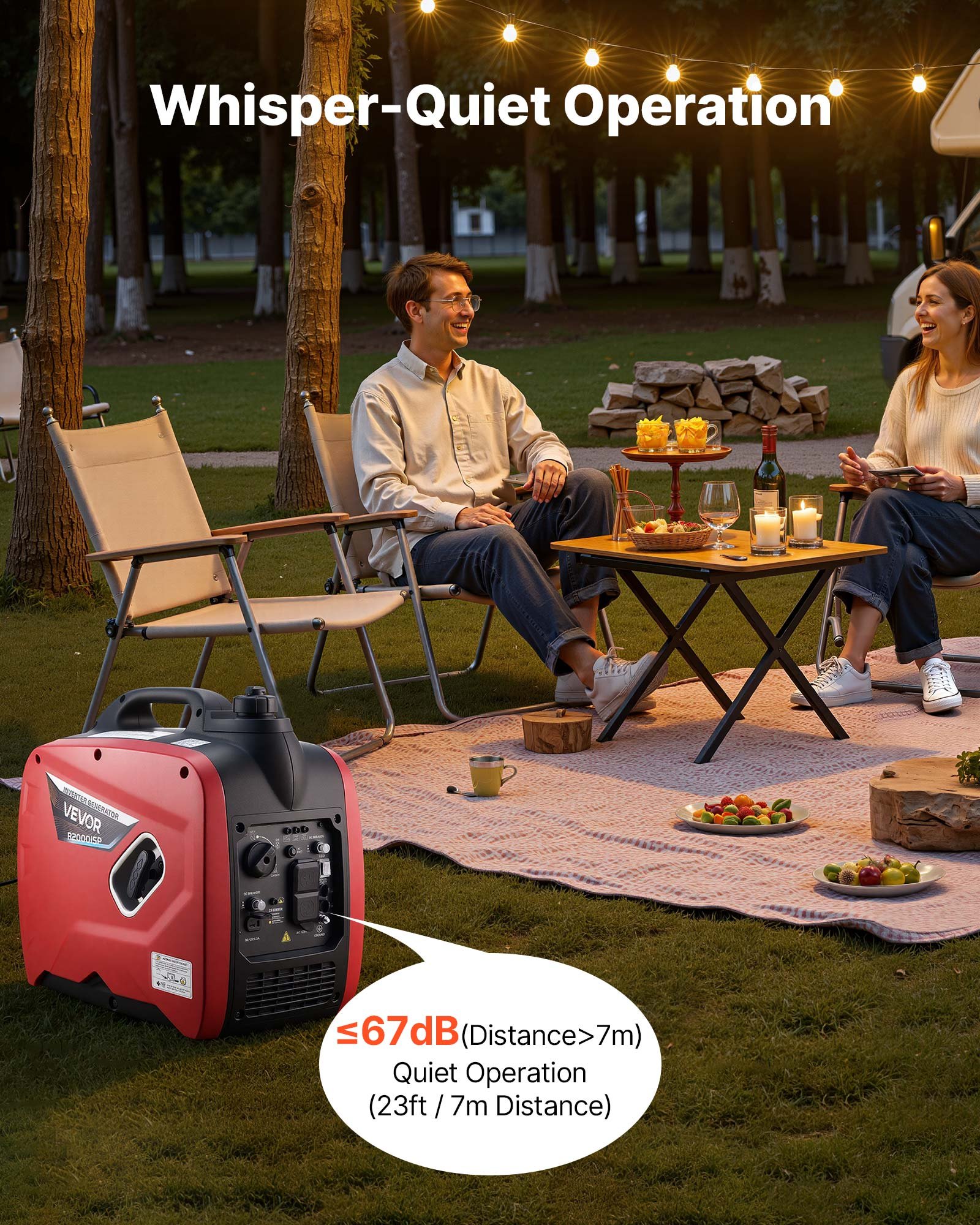 Low Noise Design: This inverter generator features advanced noise-reducing design with inverter technology, running at less than 67dB measured at 23ft (7m). It delivers stable electricity while maintaining low vibrations and minimal noise, ideal for night use or quiet outdoor activities