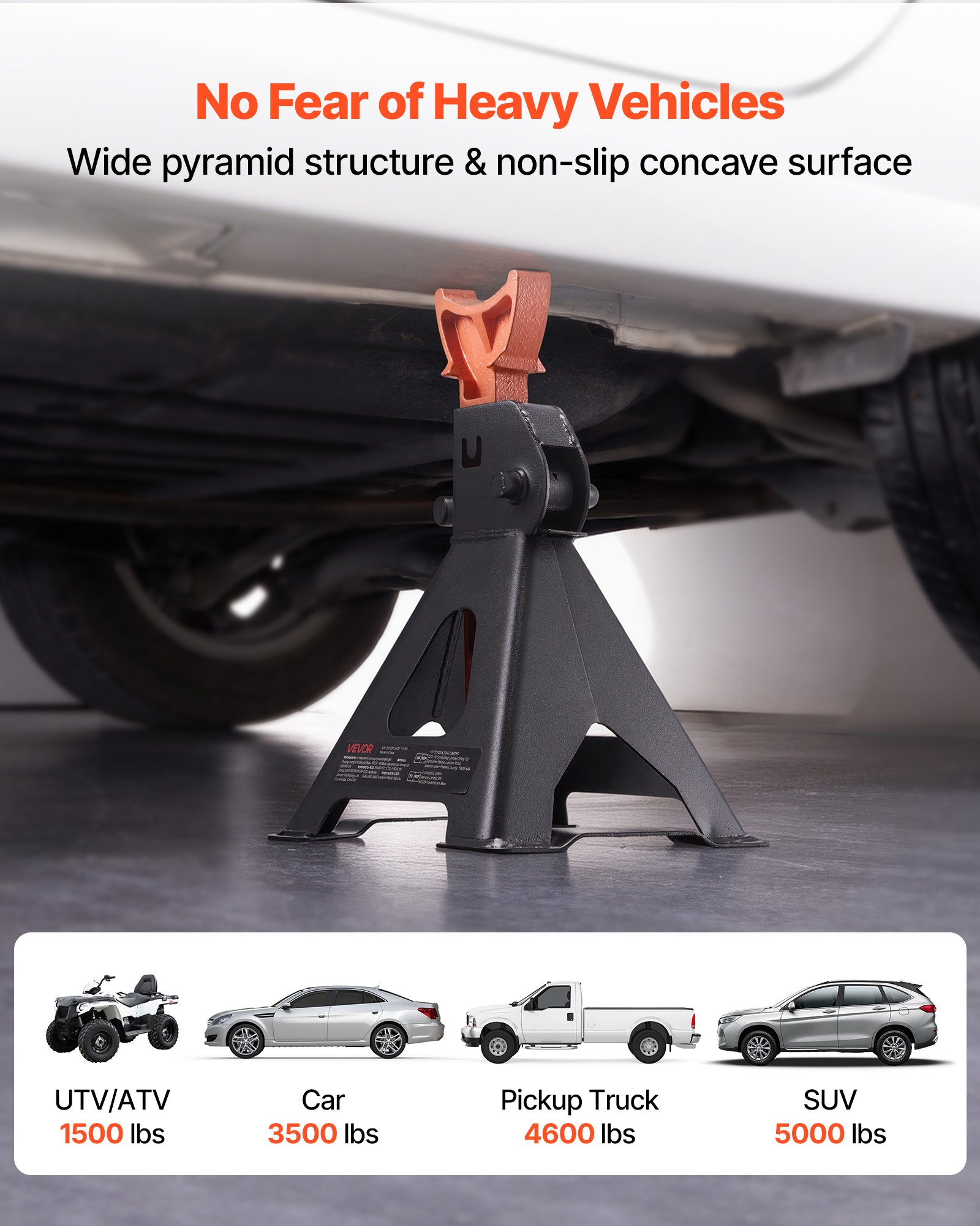 Handle Big Loads: Our jack stands feature a 3-ton (6,600 lbs) load capacity and are designed to support SUVs, pickup trucks, cars, UTVs, and ATVs. Built to meet CE standards, they are designed to provide dependable support during use
