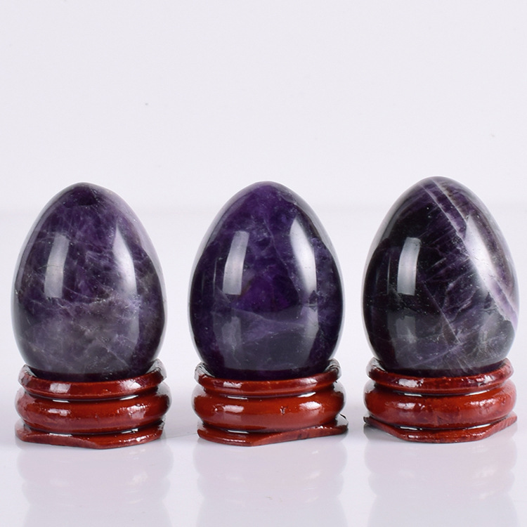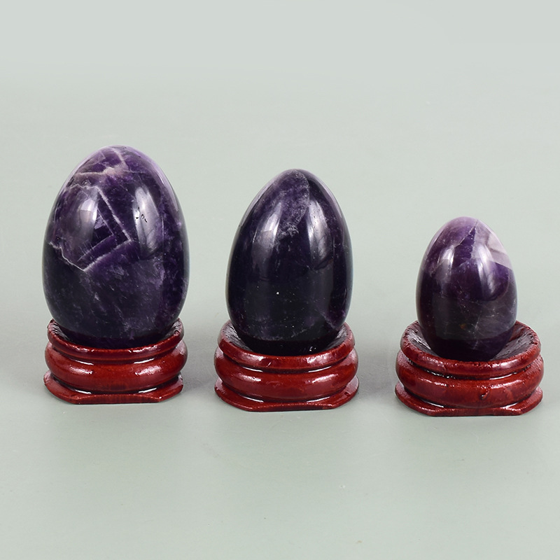 Color: 3 piece amethyst egg set with wooden base, storage bag, gift box