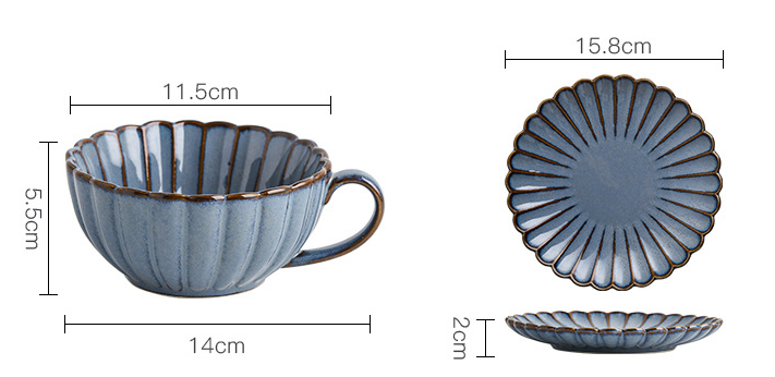 Color: Beige chrysanthemum coffee cup and saucer, blue chrysanthemum coffee cup and saucer