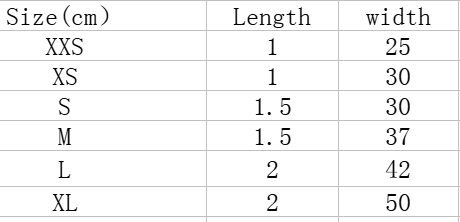 Specifications (length * width): XXS# -1.0cm width*25cm length., 1.0*30cm., 1.5*30cm., 1.5*37cm., 2.0*42cm., 2.5*50cm., 3.0*60cm.