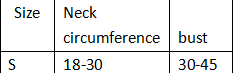 S Bust 30-45cm Neck circumference 18-30cm Drawstring 120*1.0cm, M Bust 38-59cm Neck circumference 27-40cm Drawstring 120*1.0cm